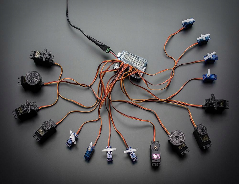 - Złącza 3-stykowe w grupach po 4, dzięki czemu można podłączyć 16 serwomechanizmów jednocześnie (wtyczki Servo są nieco szersze niż 0,1 ”, więc można układać tylko 4 obok siebie w header 0.1”