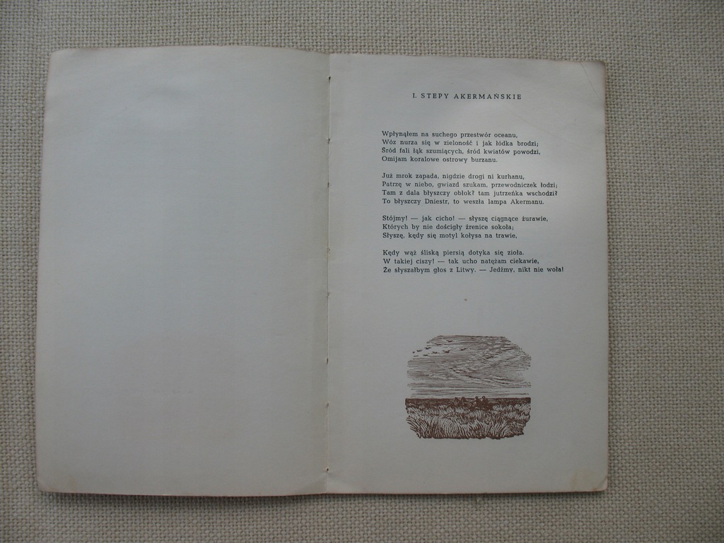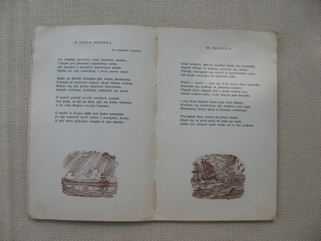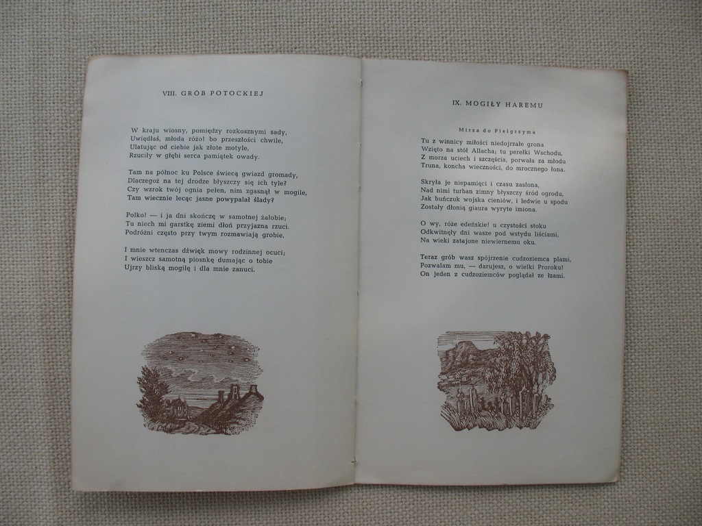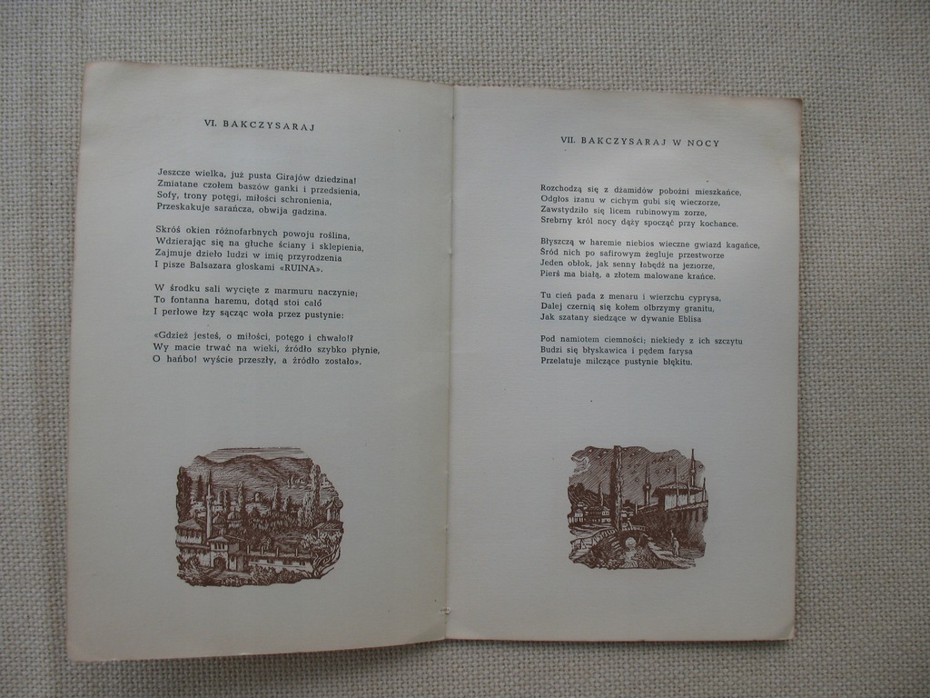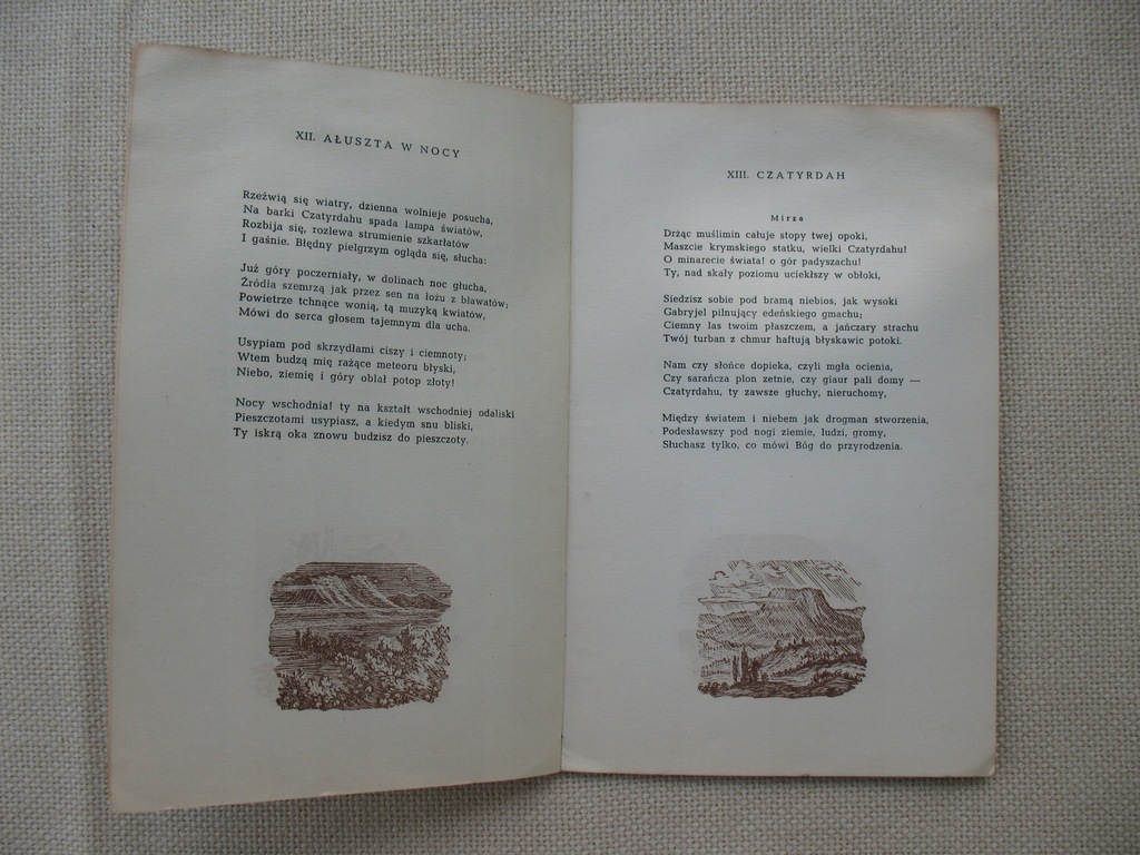 Stara, oryginalna, książka: Adam Mickiewicz Sonety Krymskie. Oryginał. 36 stron + miękka okładka - kompletna. Książka ozdobiona drzeworytami F.D. Konstantinowa / 19 sztuk /. Przykładowa zawartość na skanach. Datowanie: 1955 r. Wymiary: 125 x 193 mm. Stan zachowania: według mnie db, zabrudzenia i nadgięcia okładki, wszystko widoczne na skanach. Zapraszam do zakupów.