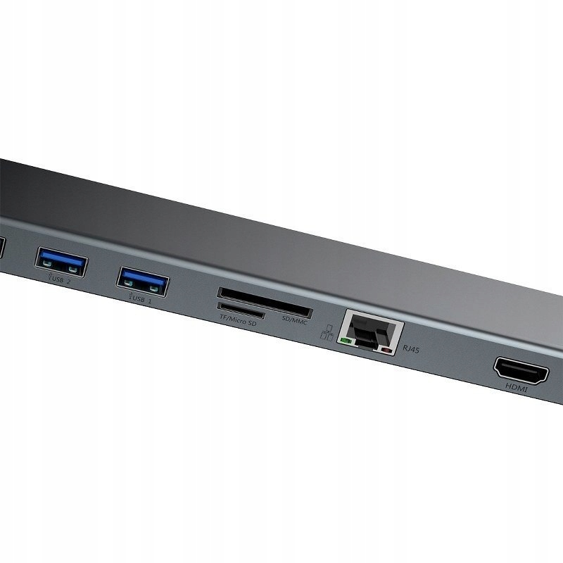 Urządzenie posiada aż jedenaście portów: 3 USB 3.0, czytnik kart SD oraz Micro SD, 2 wyjścia na kabel HDMI, wejście kabla sieciowego RJ45, wyjście VGA, USB-C (PD) oraz port audio 3.5 mm.