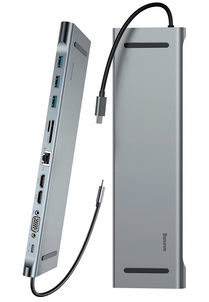 Producent Baseus Nazwa Enjoyment Series Multi-functional Type-C intelligent HD HUB Kod produktu CATSX-G0G Materiał Aluminium Kolor Srebrny Wtyczka USB-C Porty 2x HDMI, VGA, 3x USB 3.0, RJ45, audio 3,5mm, SD, micro SD, USB-C PD Wymiary 277 x 78 x 17 mm Waga 242 g Długość kabla 20 cm USB 3.0 5 Gb/s Napięcie pracy 5-20 V Prąd pracy 450-2550 mA RJ45 Gigabit