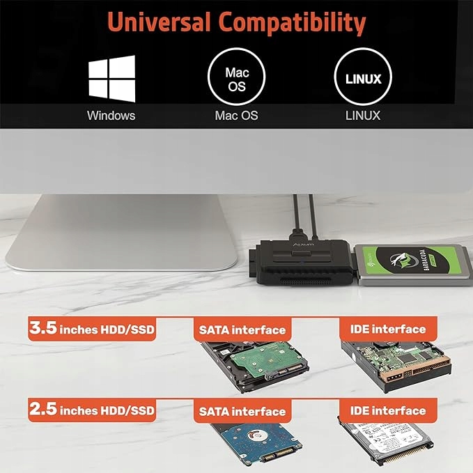 - Szeroka kompatybilność: Adapter dysku twardego IDE SATA na USB C obsługuje dowolny dysk twardy/SSD SATA 2,5''/3,5'' i dysk twardy IDE, dysk optymalny 5,25'' do pracy z systemami Windows, Linux i macOS.