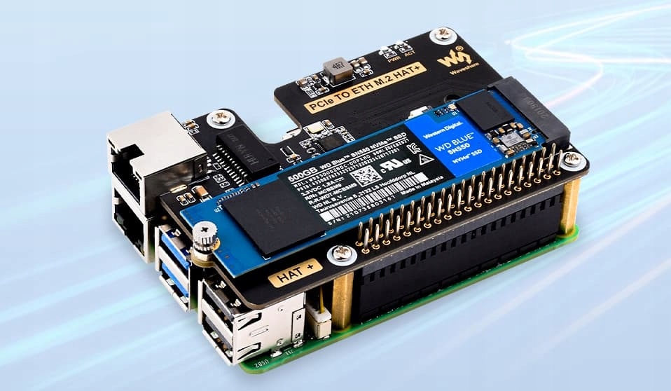Zaawansowane rozszerzenie, które umożliwia obsługę szybkich dysków NVMe oraz zapewnia port Gigabit Ethernet. Dzięki zgodności ze standardem HAT+ i wykorzystaniu złącza PCIe w Raspberry Pi 5, instalacja i konfiguracja przebiegają automatycznie, znacząco podnosząc wydajność i funkcjonalność całego systemu.