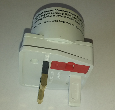 - przejście z gniazda m.in.z w krajach (w danym kraju mogą występowac też inne standardy) Bahrain, Bangladesz, Belize, Botswana, Brunei, Kamerun, Channel Islands, Chiny, Cypr, Dominika, El Salvador, Gambia, Ghana, Gibraltar, Grenada, Gwatemala, Guyana, Hong Kong, Irak, Irlandia, Isle of Man, Jordan, Kenia, Kuweit, Liban, Makao, Malawi, Malezja, Malediwy, Malta, Mauritius, Myanmar, Nigeria, Oman, Katar, St. Kitts-Nevis, St. Lucia, St. Vincent, Arabia Saudyjska, Seszele, Sierra Leone, Singapur, Tanzania, Uganda, Zjednoczone Emiraty Arabskie, Wielka Brytania, Szkocja, Wietnam (?), Jemen, Zambia, Zimbabwe i inne - patrz zdjęcie niżej, na gniazdo typu europejskiego lub USA.