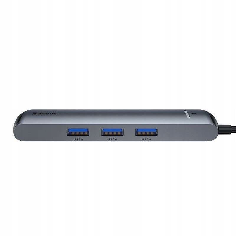 Adapter HUB 6w1 Baseus USB-C na 3x USB 3.0 + HDMI + RJ45 + USB-C PD został zaprojektowany z myślą o wysokiej prędkości transferu danych, mnogości portów oraz kompaktowej i eleganckiej budowie. Hub wyposażony został w 3 gniazda USB 3.0.