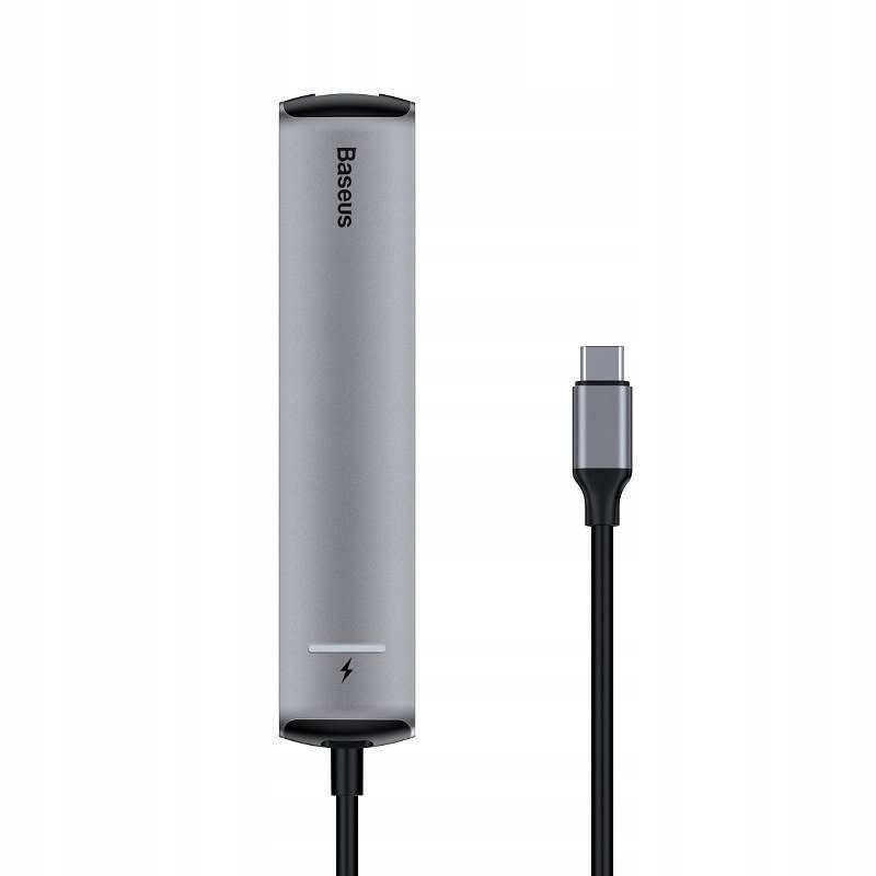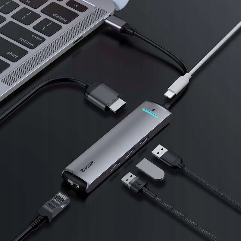 Adapter / Hub USB-C marki Baseus został zaprojektowany z myślą o wysokiej prędkości transferu danych, mnogości portów oraz kompaktowej i eleganckiej budowie. Hub wyposażony został w 3 gniazda USB 3.0, które umożliwiają obsługę zarówno zewnętrznych pamięci USB jak i peryferiów takich jak klawiatura czy myszka, 1 gniazdo gigabit ethernet, 1 gniazdo HDMI obsługujące obraz 4K oraz 1 gniazdo USB-C Power Delivery obsługujące szybkie ładowanie.