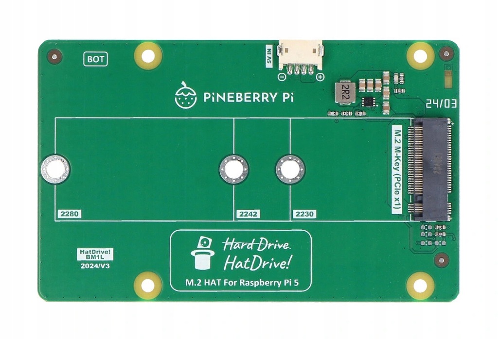 Pineberry Pi HatDrive! Bottom to innowacyjne rozwiązanie dla użytkowników Raspberry Pi 5. Urządzenie zapewnia obsługę dysków NVMe (M-key) w formatach M.2 o rozmiarach 2230, 2242 oraz 2280. Wyposażone w interfejs PCIe x1, kompatybilny zarówno ze standardami Gen2, jak i Gen3. HatDrive BM1L (BOT) oferuje także wskaźniki LED do monitorowania napięcia zasilania i aktywności dysku M.2.
