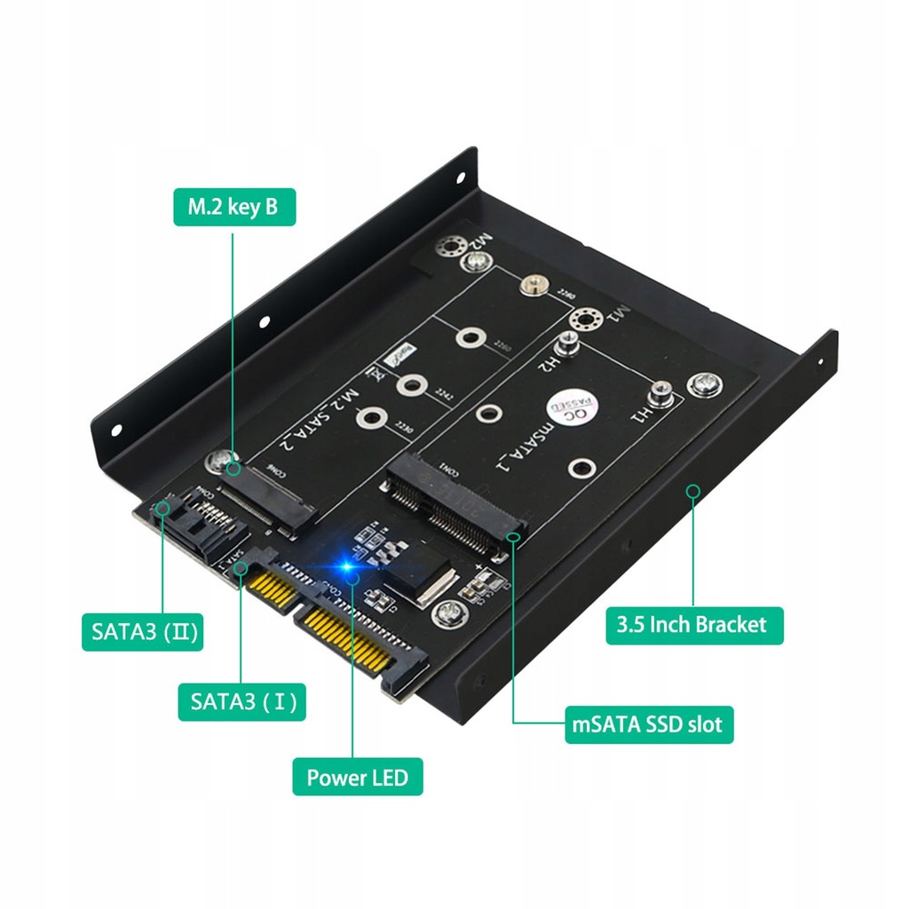 2. Wskaźnik LED: Niebieska dioda LED wskazuje stan zasilania 3,3 V. Obsługuje pełnowymiarowe (ok. 50,95 x 30 mm / 2,0 x 1,2 cala) mSATA SSD