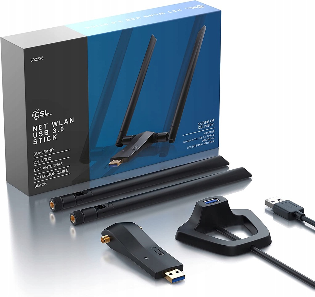 Oznaczenie modelu: CSL AC1200 WLAN adapter AC1200 (2,4 + 5 GHz) z wydajną zdejmowaną podwójną anteną o wysokiej wydajności i szybkim złączem USB 3.0 SuperSpeed | standard Wi-Fi najnowszej generacji (802.11ac) | optymalnie nadaje się do gier online, strumieniowania wideo HD, VoIP / innowacyjna technologia Dual Band zapewnia lepszą stabilność i prędkość oraz bezpieczne Wi-Fi bez konfiguracji. Najnowszy standard AC WLAN | 302226.