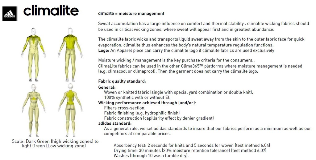 climalite™ - to tkanina w 100% syntetyczna, wchłania pot z powierzchni skóry i odprowadza go do jej zewnętrznej warstwy, aby szybciej wyparował. Dla prawidłowego funkcjonowania, ta cześć odzieży powinna być blisko ciała (odpowiednio dopasowana). Utrzymuje ciało suche. Daje uczucie komfortu. Zabezpiecza ciało przed przegrzaniem w wysokich temperaturach. Umożliwia ciału utrzymanie stałej temperatury dla poprawy wyników sportowych. Obniża prawdopodobieństwo przeziębienia się po ćwiczeniu.