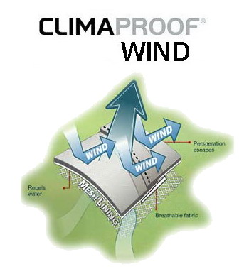 ClimaProof® Wind - technologia, która odpowiedzialna jest za ochronę przed ekstremalnymi warunkami pogodowymi. Ze względu na swoje właściwości idealnie sprawdzi się w trudnych warunkach pogodowych. Doskonała nie tylko dla pasjonatów turystyki typu trekking lub outdoor ale również do użytku codziennego w wietrzne dni.