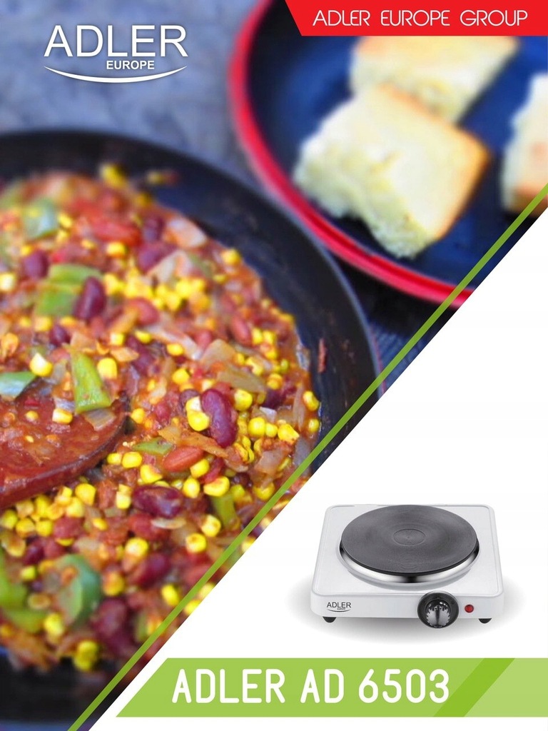 Jednopalnikowa kuchenka elektryczna to wyposażenie kuchni w wersji mini. Może służyć do odgrzewania lub przygotowania posiłków nie wymagających równoczesnego wykorzystania dwóch garnków lub patelni. Kuchenka AD 6503 może być traktowana jako opcja awaryjna, na czas niedostępności głównej kuchenki. Może też stać się stałym wyposażeniem domku letniskowego, niewielkiej kuchni, wynajmowanego pokoju lub innego pomieszczenia. Kuchenka umożliwia płynną regulację temperatury.