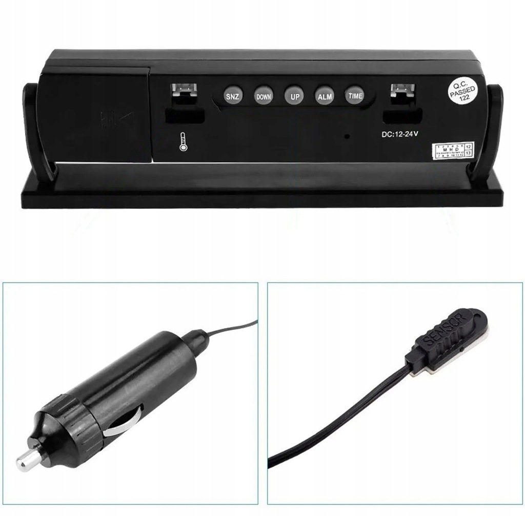 Elektroniczny termometr samochodowy z zegarkiem oraz pomiarem stopnia naładowania akumulatora. Termometr posiada duży, czytelny wyświetlacz LCD z podświetleniem (zasilany z 12V gniazda zapalniczki samochodowej) wyświetlającym jednocześnie temperaturę z dwóch czujników, godzinę oraz napięcie akumulatora. Długi przewód z wodoodpornym czujnikiem temperatury zewnętrznej umożliwia umiejscowienie czujnika aż pod przednim zderzakiem, co gwarantuje najlepszy pomiar temperatury zewnętrznej w czasie jazdy i postoju. Możliwość zmiany formatu wyświetlania godziny (12 lub 24) oraz jednostki temperatury (C / F). W zestawie mocna, dwustronna taśma klejąca umożliwiająca łatwe zamocowanie termometru na tapicerce samochodu.