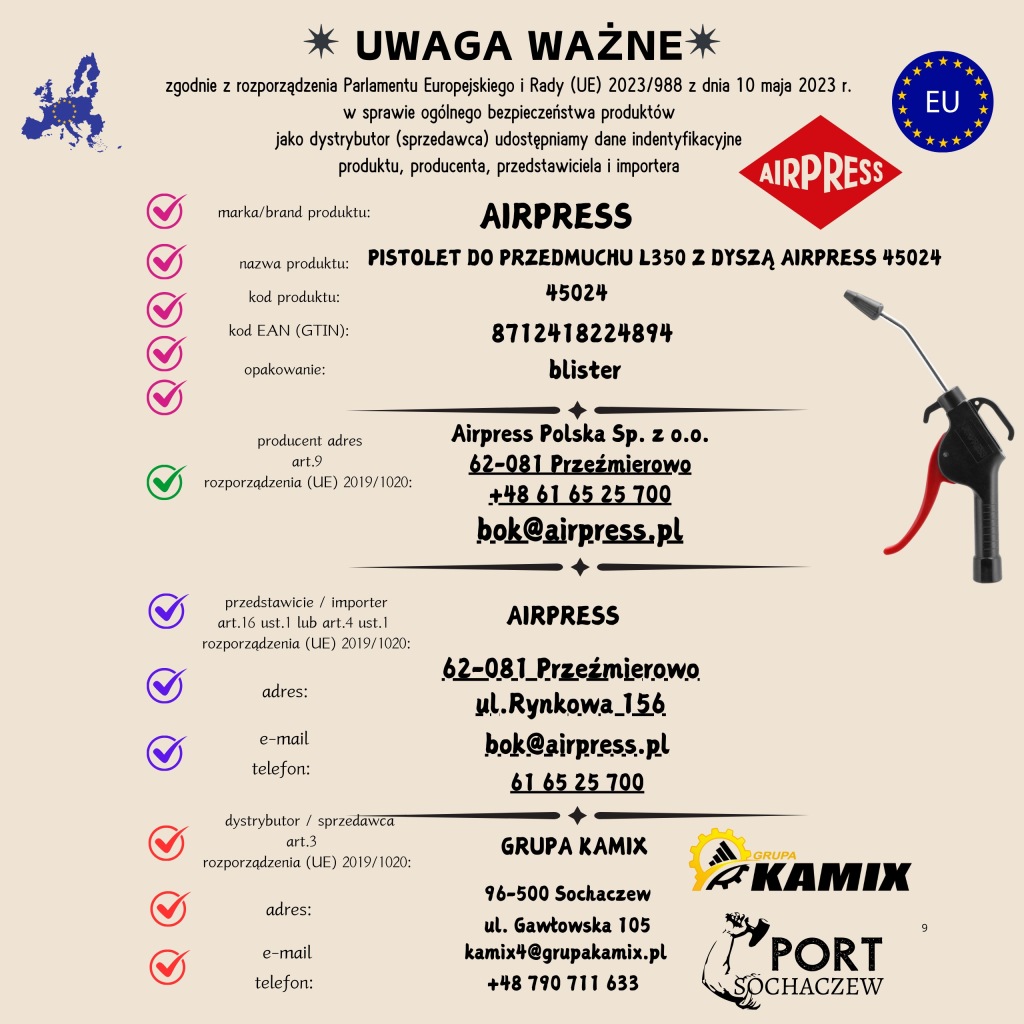 - Pistolet w komplecie sprzedawany jest z dwiema końcówkami przyłaczeniowymi o rozmiarze 1/4 cala typu EURO oraz ORION.