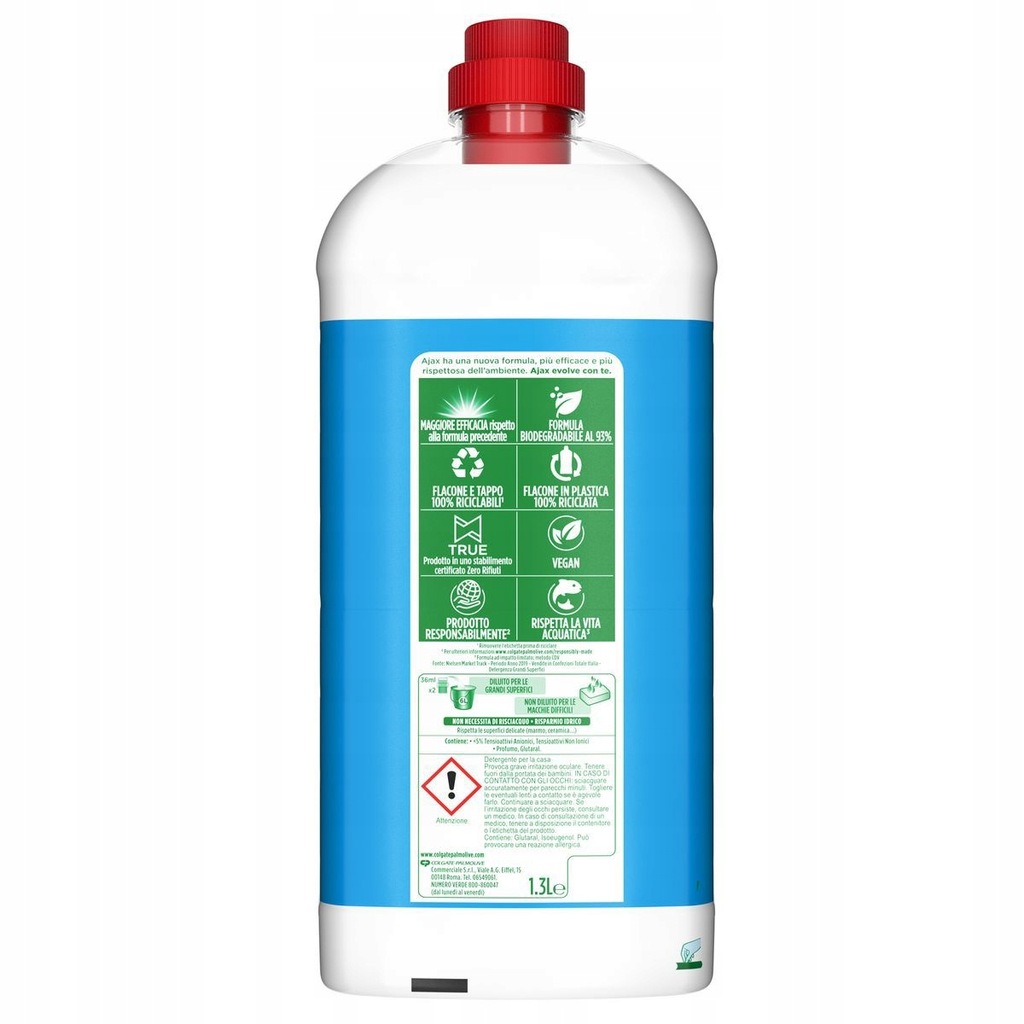 Detergent do podłóg Ajax Classico Multi-surface dzięki swojej super silnej formule zapewnia głębokie czyszczenie, intensywną świeżość i połysk na wszystkich powierzchniach. Większa skuteczność niż poprzednia formuła. Formuła biodegradowalna w 93%. Butelka z tworzywa sztucznego pochodzącego w 100% z recyklingu.