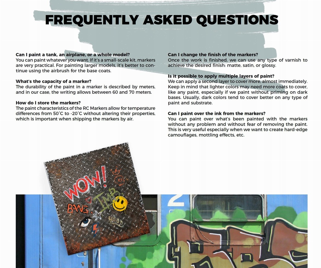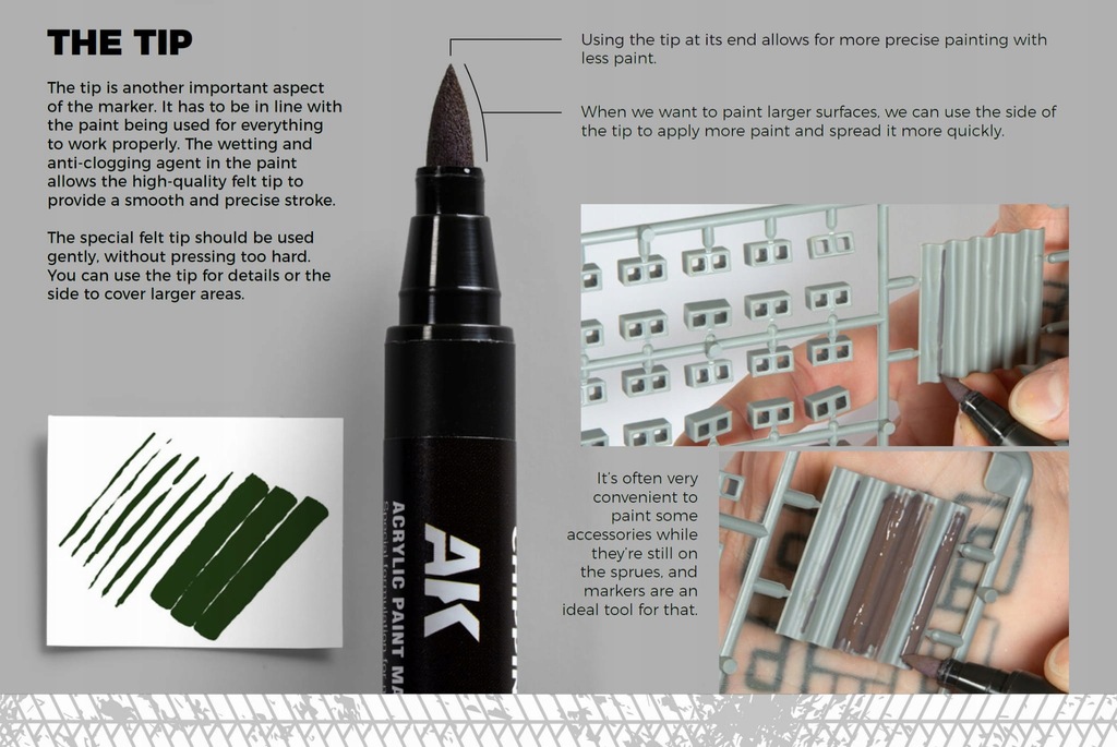 Markery te mają doskonałą przyczepność do powierzchni plastikowych, żywicznych, metalowych i drewnianych. Kolory są odporne na wodę i ciepło. Mogą być nakładane warstwami jak każda inna farba modelarska. Wysoki stopień krycia. Nie rozmazują się. Umożliwiają późniejsze nakładanie weatheringu przy użyciu dowolnego produktu bez obawy o usunięcie farby.