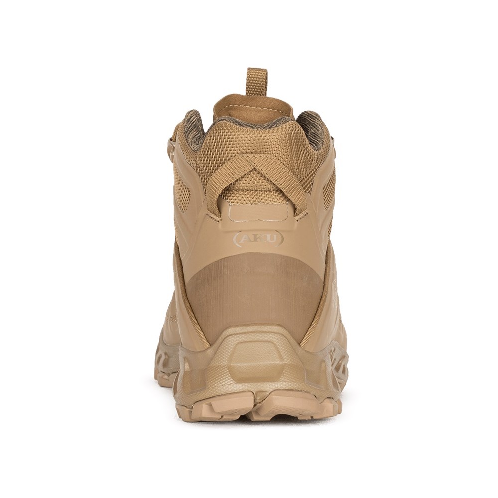 Buty taktyczne AKU Selvatica Tactical Mid GTX w części cholewki wykonane zostały z połączenia syntetycznych materiałów współpracujących z membraną GORE-TEX® Extended Comfort i jej oddychalnością. Za lepsze odprowadzanie wilgoci odpowiada tutaj AIR8000®, a wzmocnienia z poliuretanu chronią ten model przed łatwymi uszkodzeniami, gdy na przykład zahaczysz o korzeń wystający ze szlaku. Oddychalność połączonych rozwiązań ogranicza nieprzyjemne przegrzewanie i oddala jego ryzyko, a także sprawia, że w trakcie odpoczynku buty o wiele szybciej wysychają, co niewątpliwie pozytywnie wpływa na komfort wędrówki. Sama konstrukcja cholewki jest odpowiednio trwała, by znieść naprężenia powstające na niej podczas marszu po zmiennym górskim podłożu. Dodatkowo utwardzony czubek oraz krótki otok na froncie tego modelu okażą się skutecznym zabezpieczeniem, gdy poruszasz się po skalistym szlaku. Membrana GORE-TEX® Extended Comfort to także niezbędna w terenie wodoodporność, więc nagła zmiana pogody i padający z nieba deszcz nie sprawią, że będziesz musiał gwałtownie szukać schronienia. Jest to istotne, gdyż nieprzewidywalność warunków panujących na wysokościach nie może przecież Cię ograniczać.