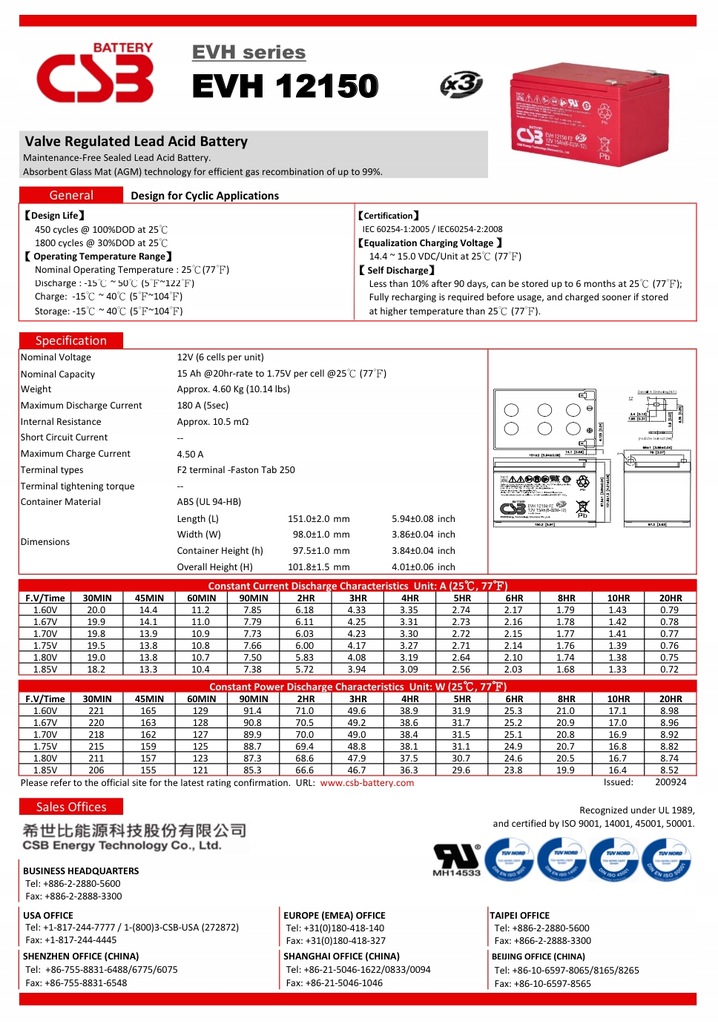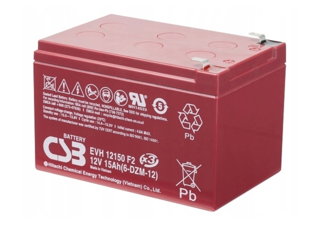 Akumulator CSB EVH 12150 F2 x3 (12V/15Ah 6-DZM-12) to specjalistyczny, bezobsługowy akumulator VRLA - szczelna bateria produkcji CSB Battery wykonana w technologii AGM. Akumulatory te zostały zaprojektowane przez producenta specjalnie do pojazdów elektrycznych. Pomimo podwyższonej pojemności i żywotności, mają standardowe wymiary baterii typu 6-DZM-12, tj: Dł. 151 mm, Szer. 98 mm, Wys. 98 mm.