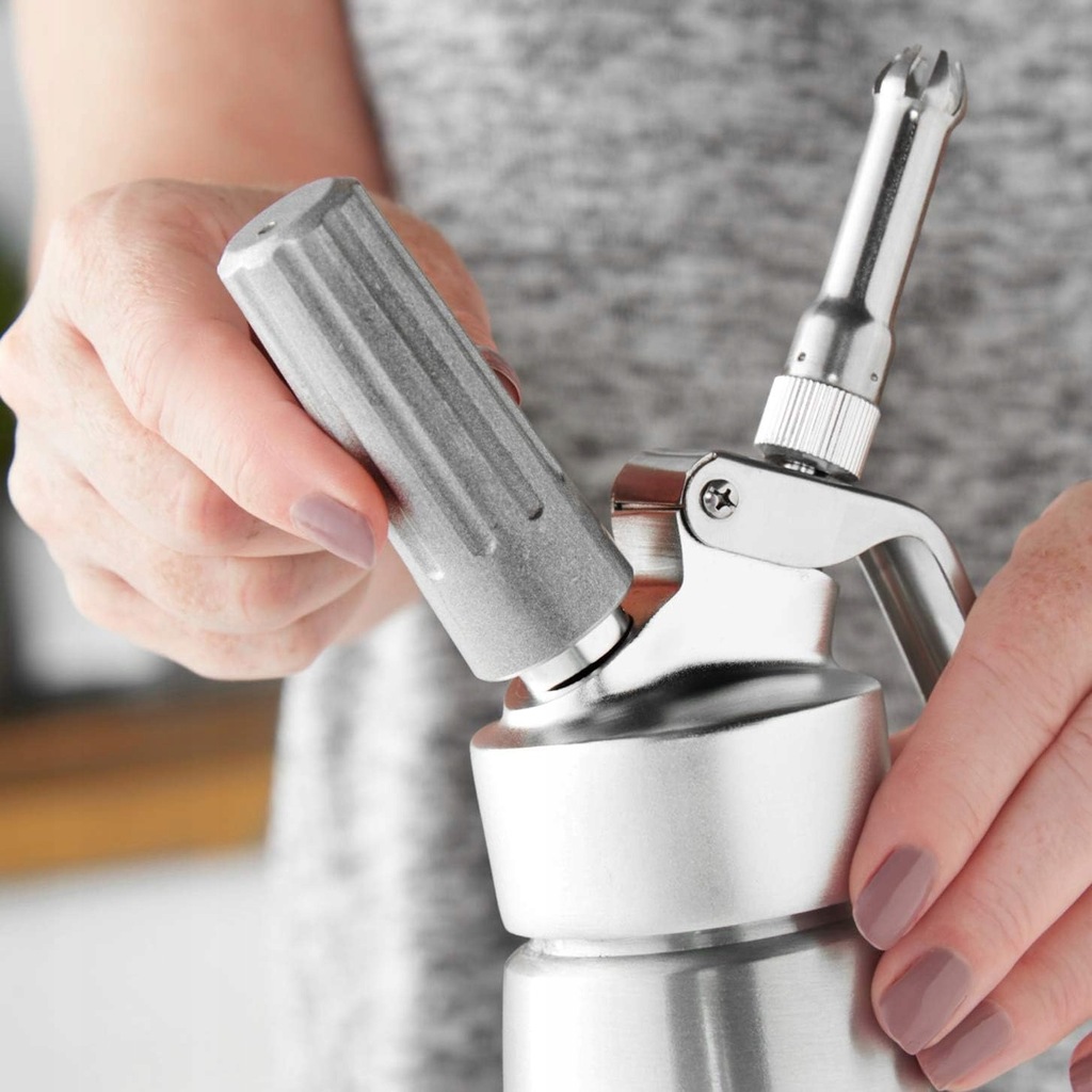 - Wykonany z wysokiej jakości stopu aluminium, mocny i trwały. Niezależny silikonowy pierścień uszczelniający gwarantuje szczelność i zapobiega przelewaniu się śmietany.