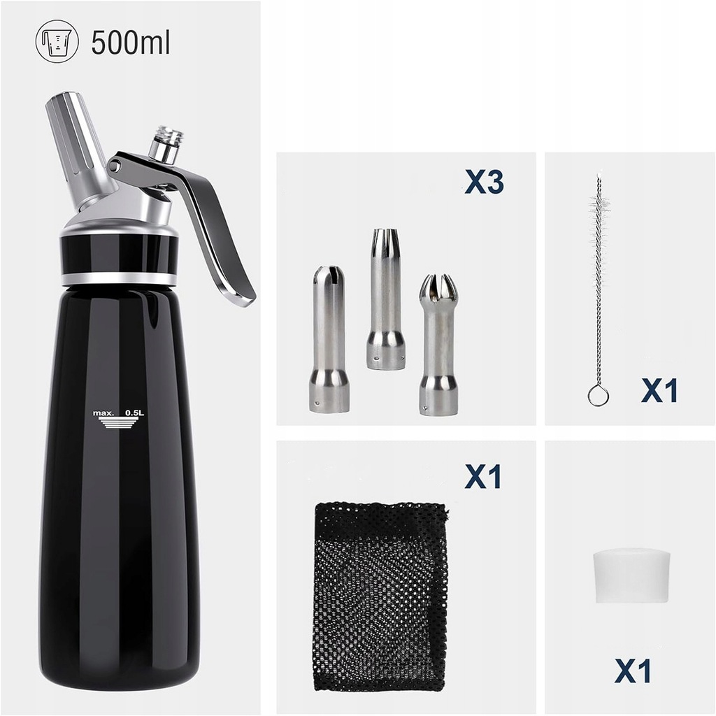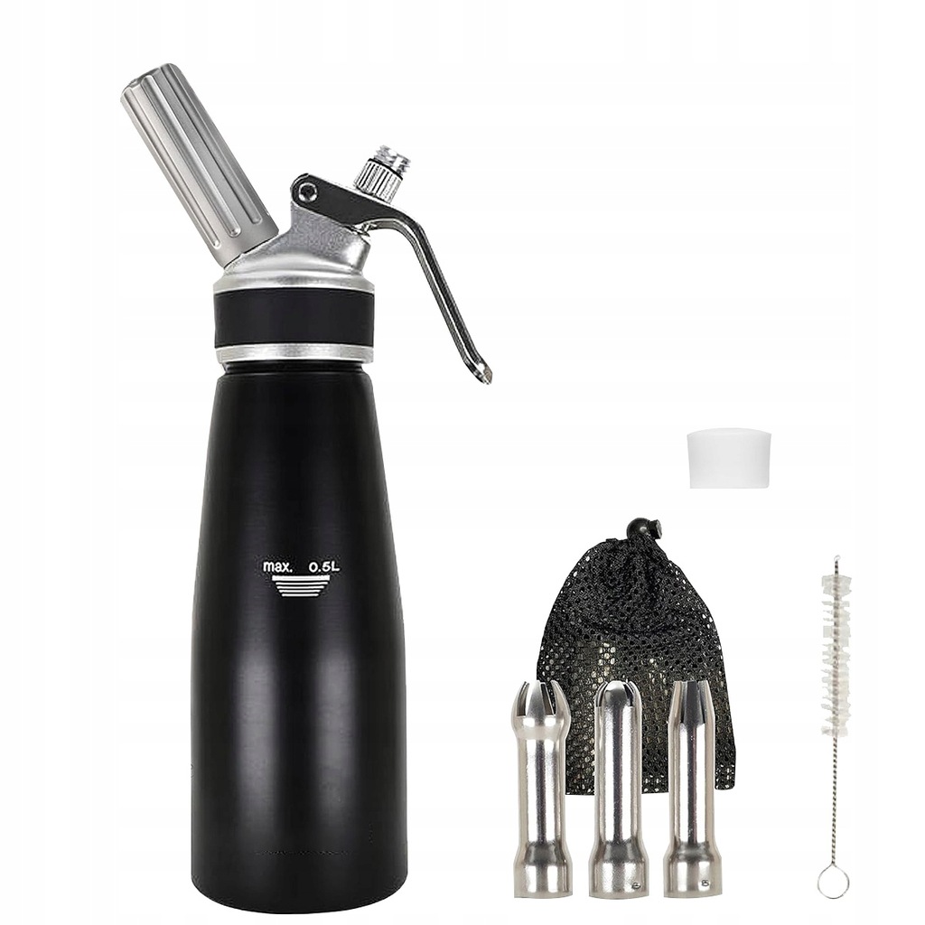 Dozownik do śmietany 500 ml, wysokiej jakości aluminiowy syfon do śmietany z 3 dyszami ze stali nierdzewnej i uchwytem na kapsułki do śmietany, espumy, zimnych i ciepłych sosów (czarny)