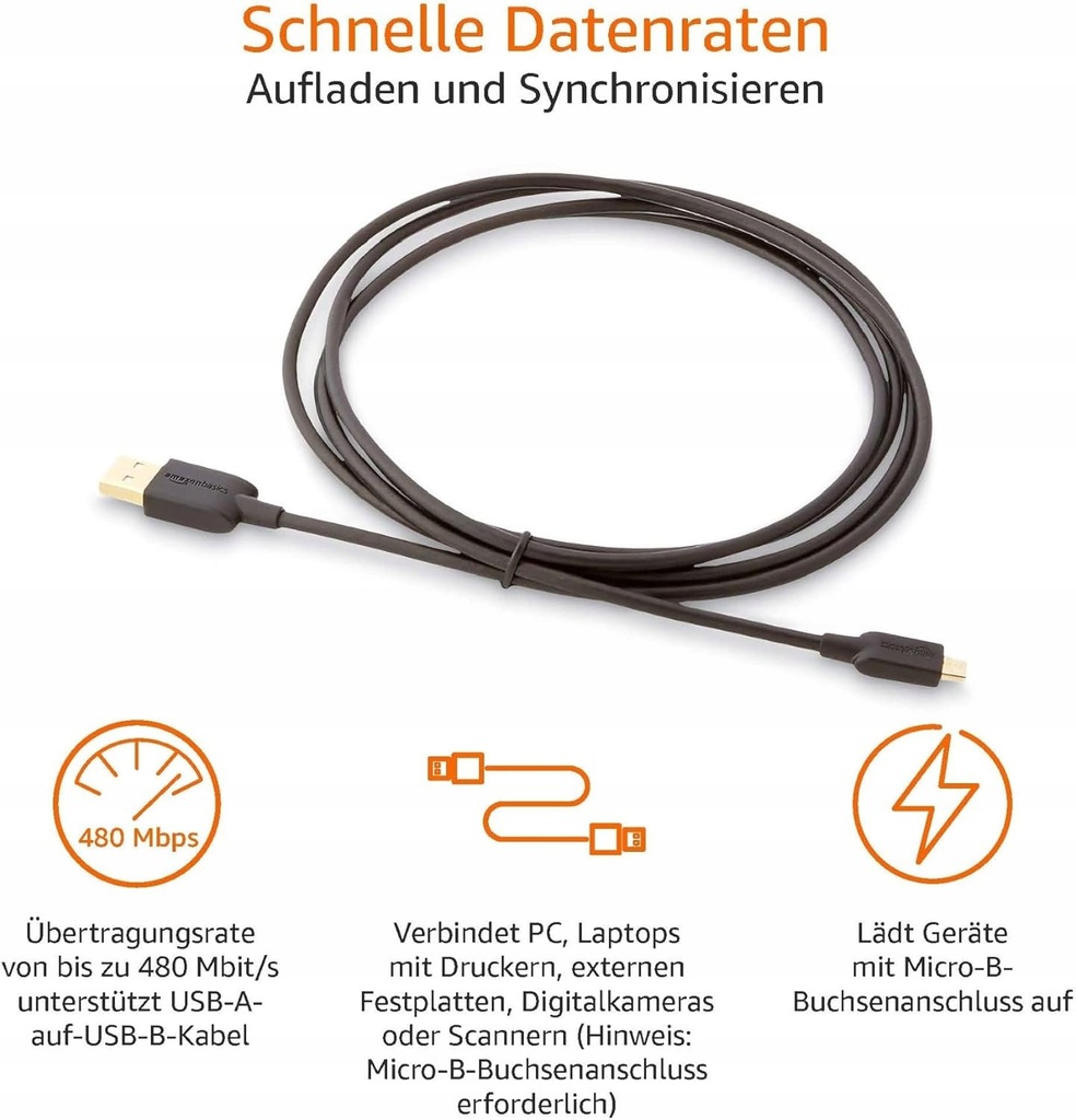 Kabel USB 2.0 z wtyczką USB-A i Micro-USB-B; obsługuje prędkość transmisji danych do 480 Mbit/s