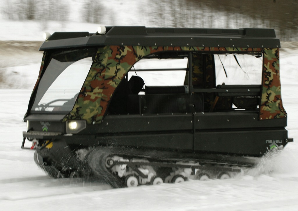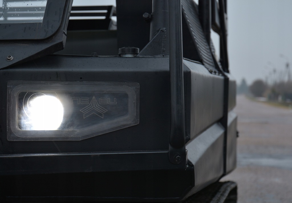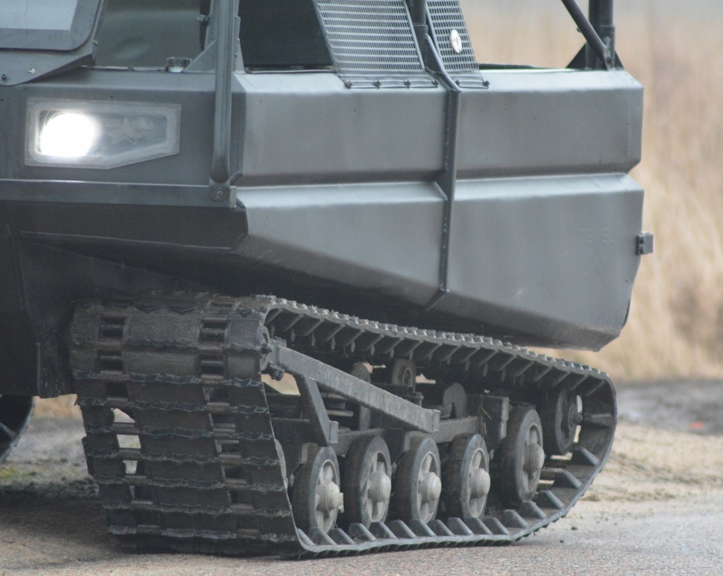 - Stały napęd gąsienicowy, umożliwiający jazdę przez głęboki śnieg i grzęzawiska błotne