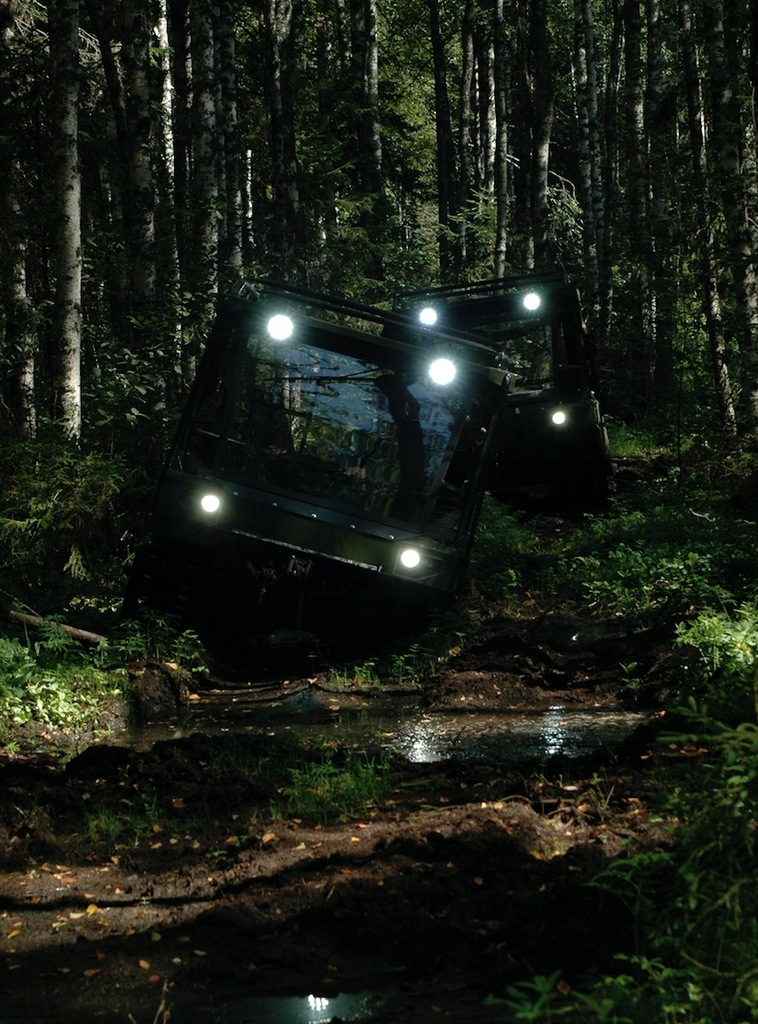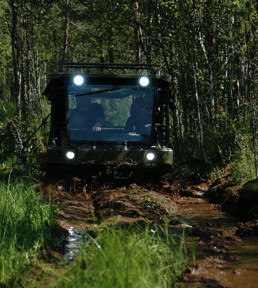 Jest taki rosyjski bard, Aleksandr Rozembaum. Śpiewa piosenki o życiu i śmierci twardych facetów. Konstruktorzy tej amfibii pewnie się nim inspirowali. Amfibia jest pojazdem dla osób, które potrzebują dotrzeć w do celu w ekstremalnych warunkach. Ma mocno czołgową charakterystykę. Jest bezpieczniejsza niż Quad, w dodatku pływa, no i zabiera 6 osób.