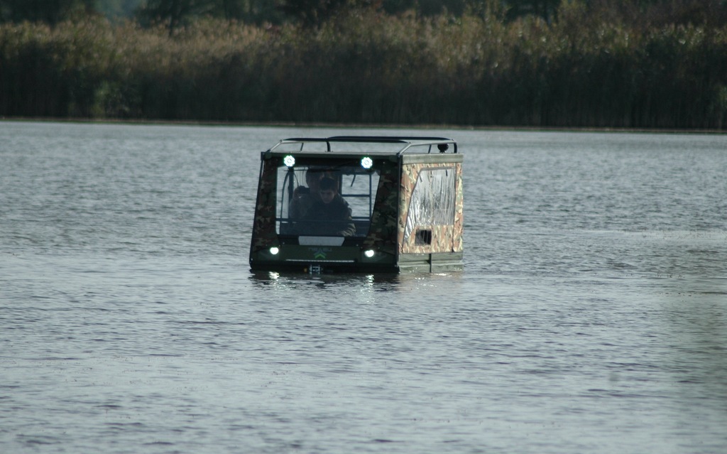 Amfibijny pojazd terenowy klasy AATV (Amhibious All Terrain Vehicle), amfibijny, znaczy pływający.