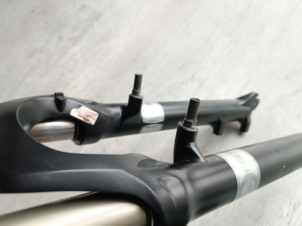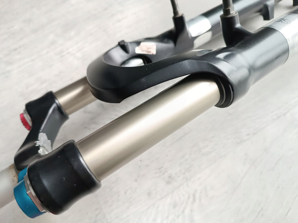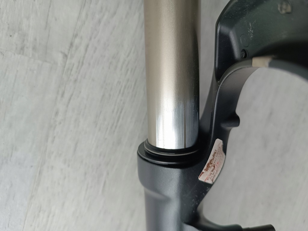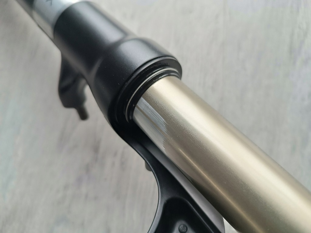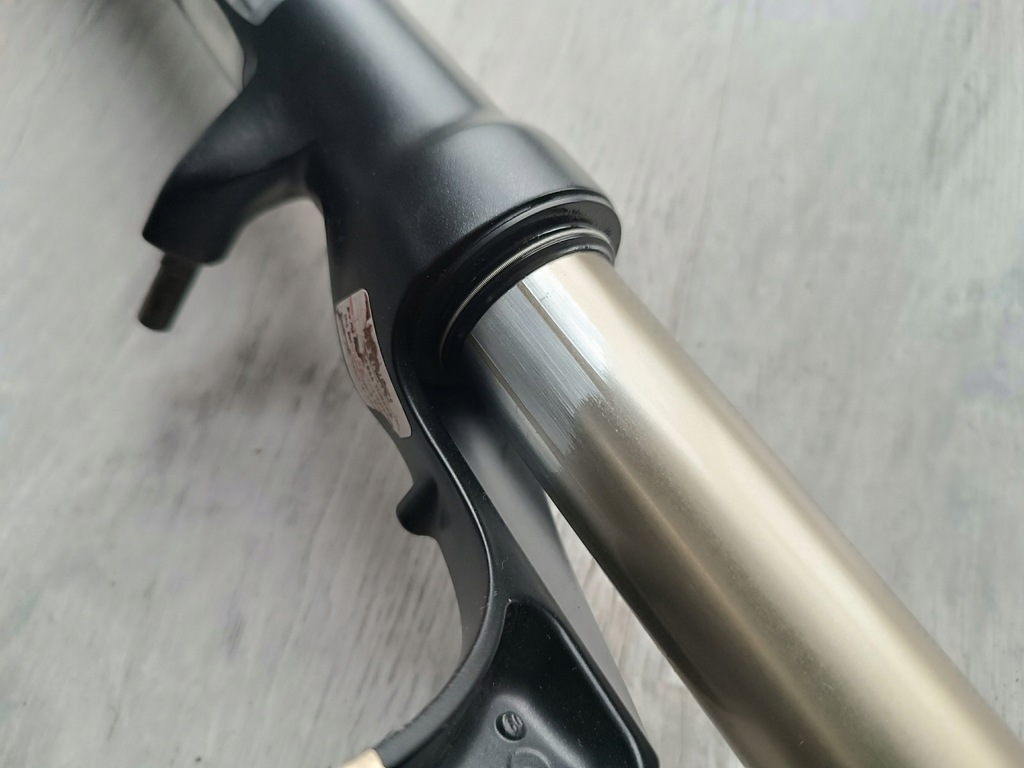 Amortyzator bezpośrednio po serwisie. Ma wytartą jedną z goleni. Wytarcie dokładnie widoczne na zdjęciach. Technicznie amortyzator sprawny, pracuje płynnie pełnym skokiem, tłumienie i blokada działa prawidłowo.