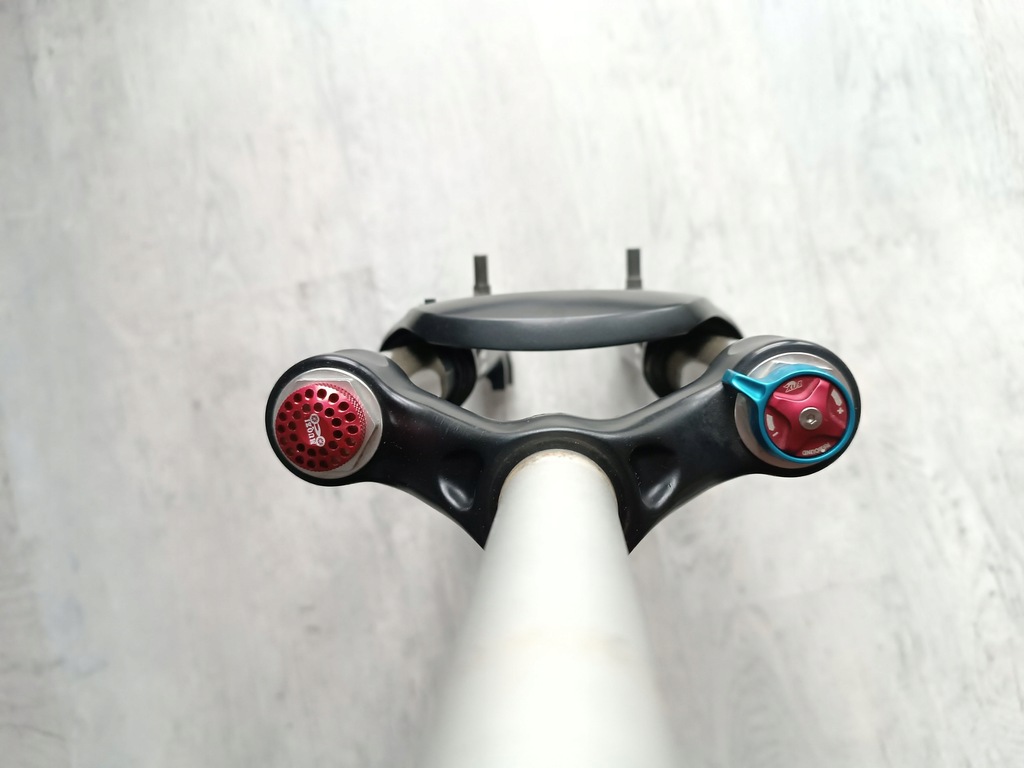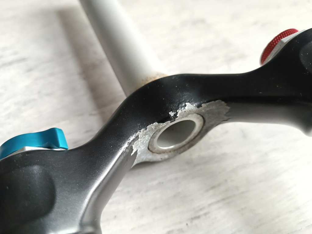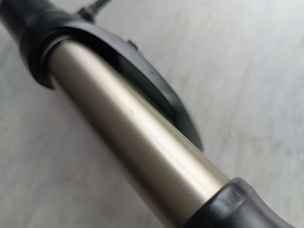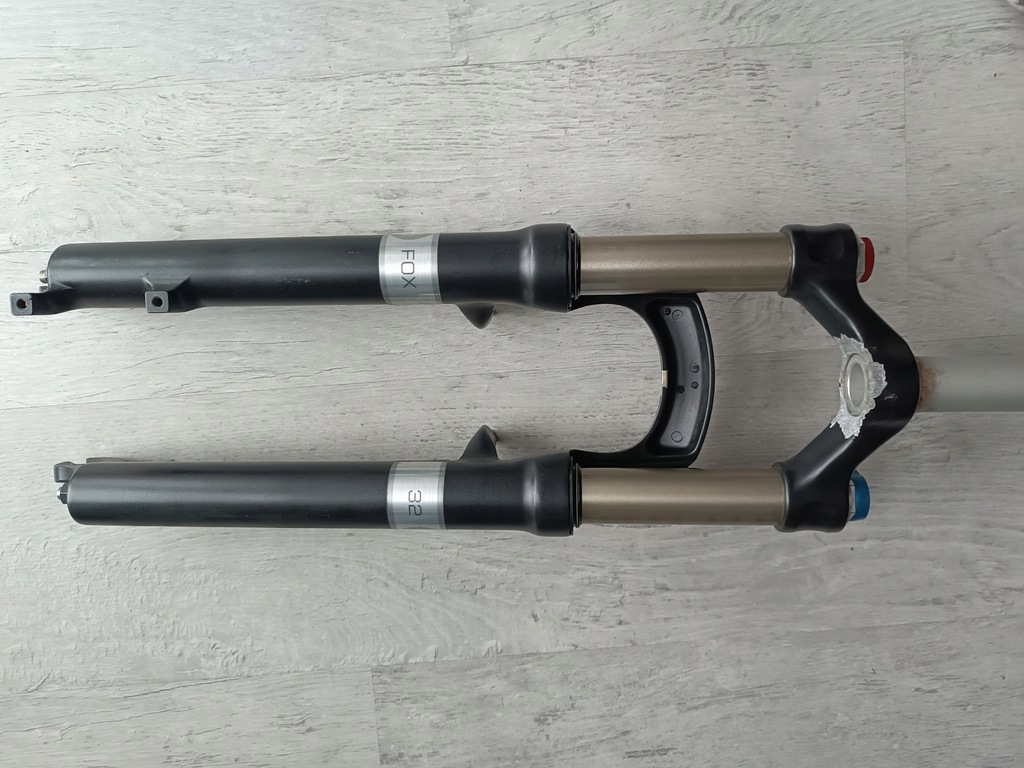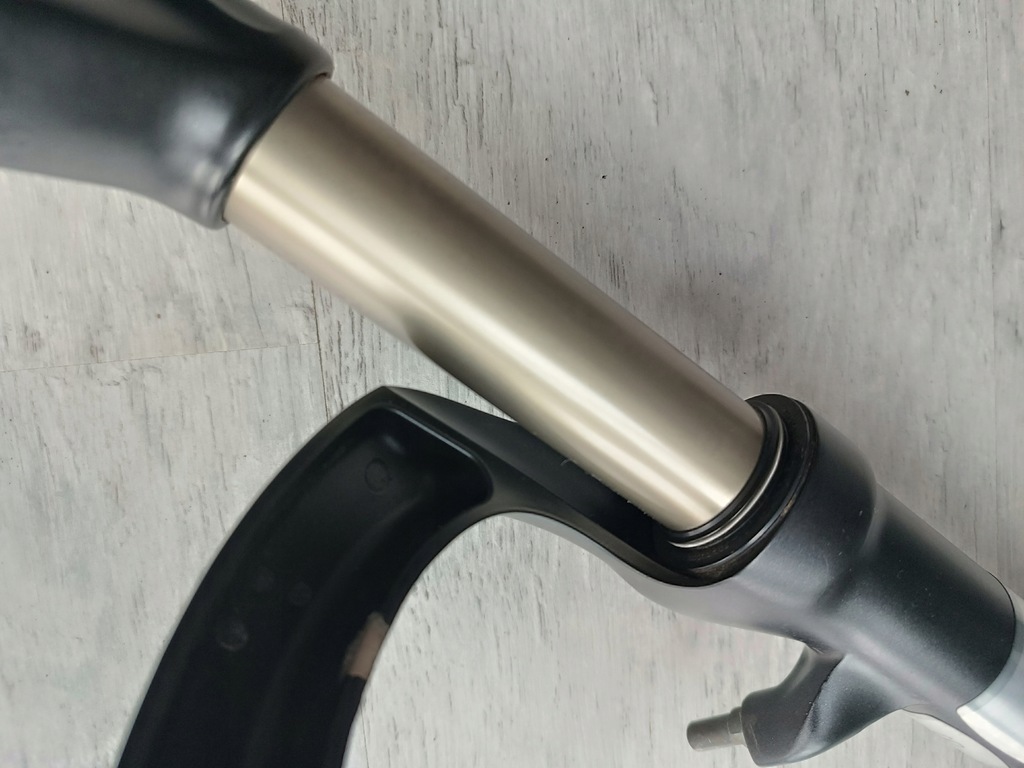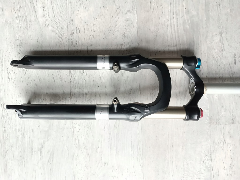 Amortyzator bezpośrednio po serwisie. Ma wytartą jedną z goleni. Wytarcie dokładnie widoczne na zdjęciach. Technicznie amortyzator sprawny, pracuje płynnie pełnym skokiem, tłumienie i blokada działa prawidłowo.