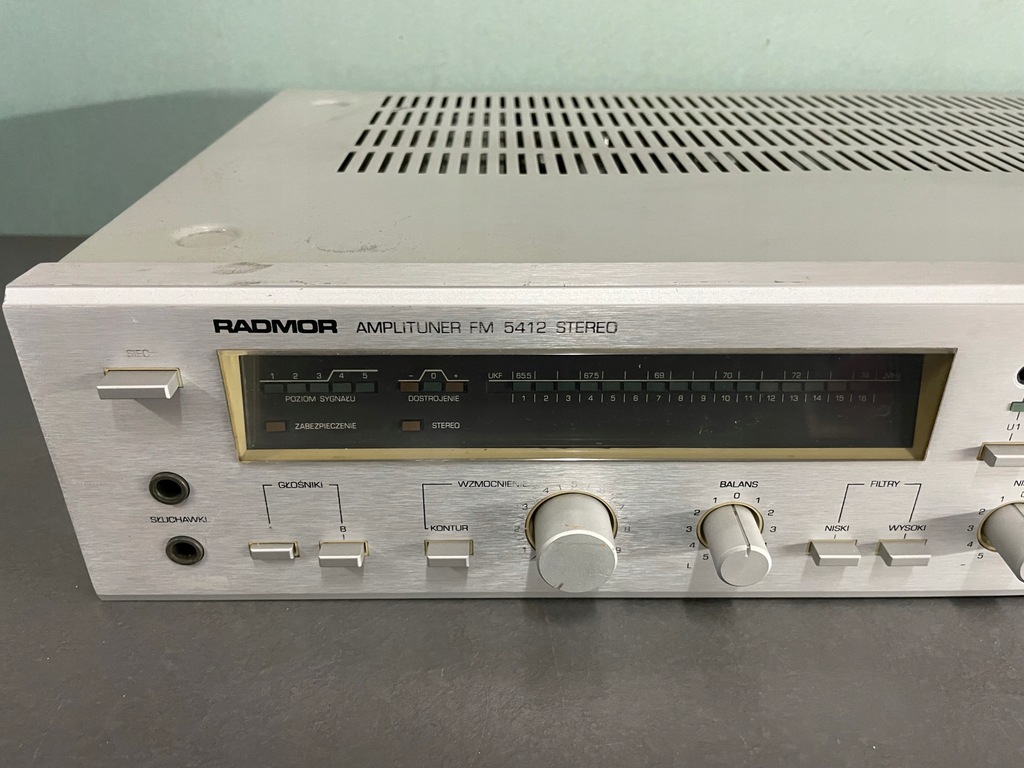 Sprzedam amplituner RADMOR 5412. Stan wizualny jak na zdjęciach. Brak gumowych nóżek. Do naprawy - świeci dioda od zabezpieczenia.