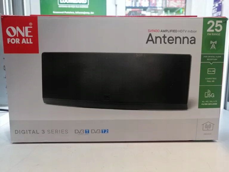 - Wzmacniana antena wewnętrzna One For All SV9430-5G DVB-T (5G/4G) zasięg 25kmPełna telewizja wysokiej rozdzielczości Ta antena wewnętrzna jest zgodna z programami DVB-T/T2 nadawanymi w formacie Full HD.