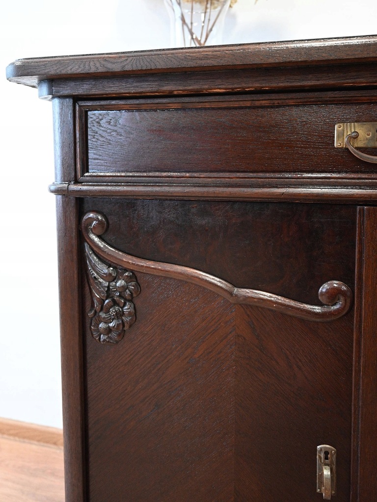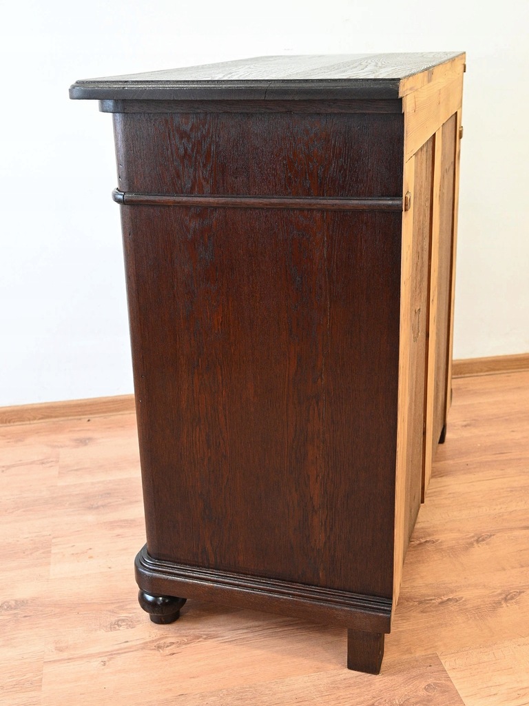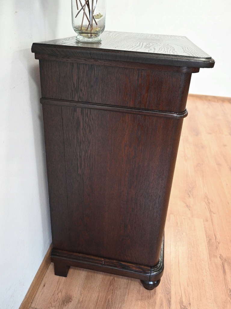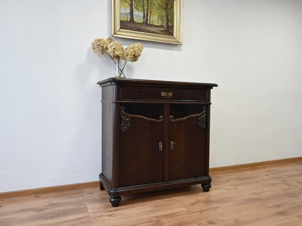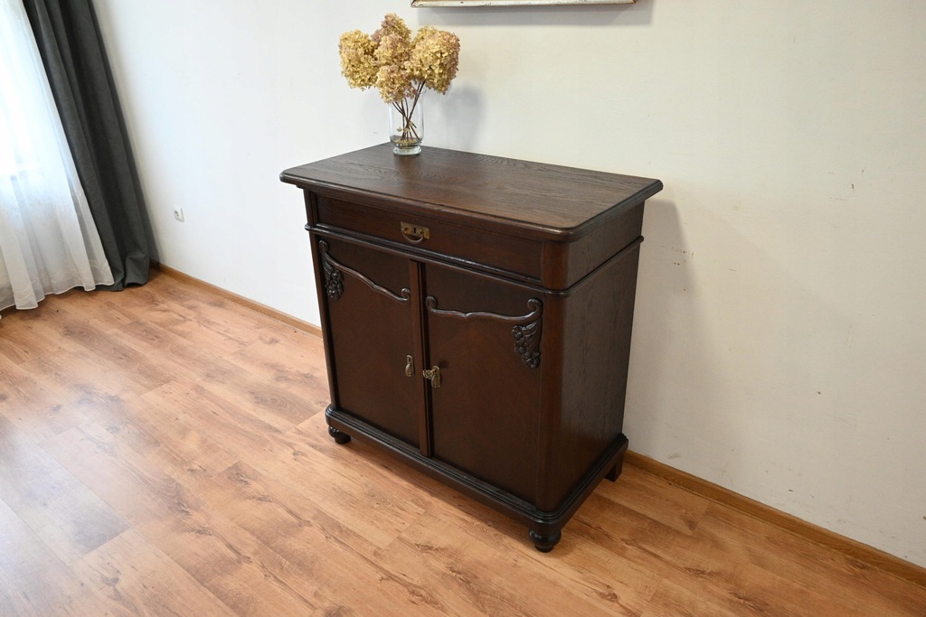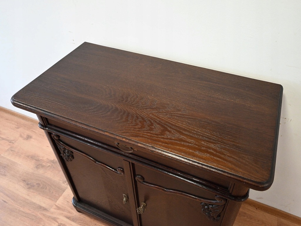 Stan bardzo dobry. Mebel przygotowany do użytkowania. Odświeżone zostały powierzchnie zewnętrzne jak i środek mebla. Mebel ma już swoje lata i ślady minionego czasu, które nie wpływają na jego odbiór estetyczny, są świadectwem autentyczności mebla. Komodę od razu można wstawić do mieszkania.