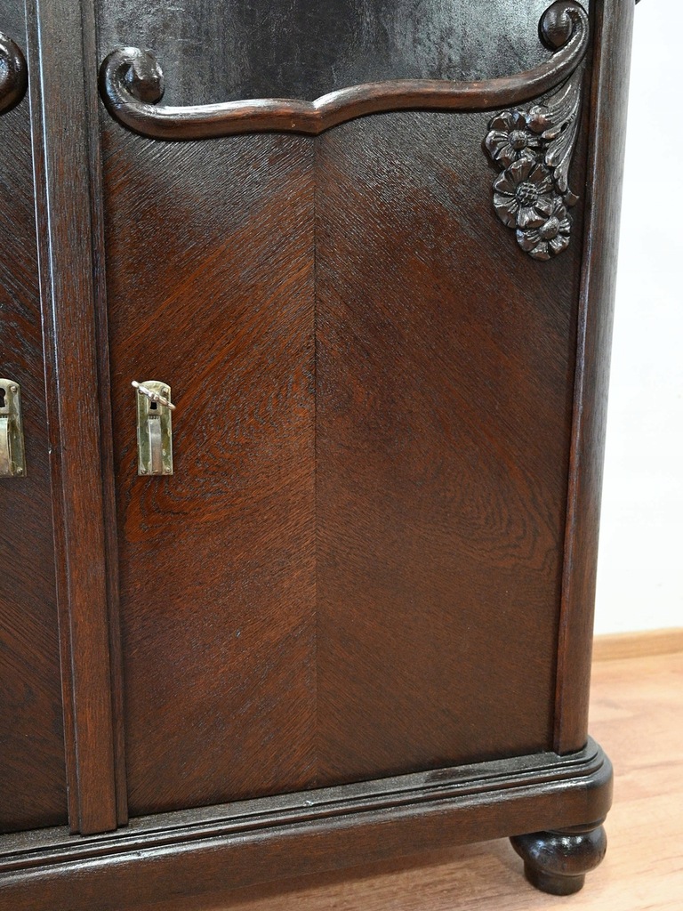Zamek przy drzwiczkach sprawny, jeden kluczyk w komplecie. Okucia oryginalne.