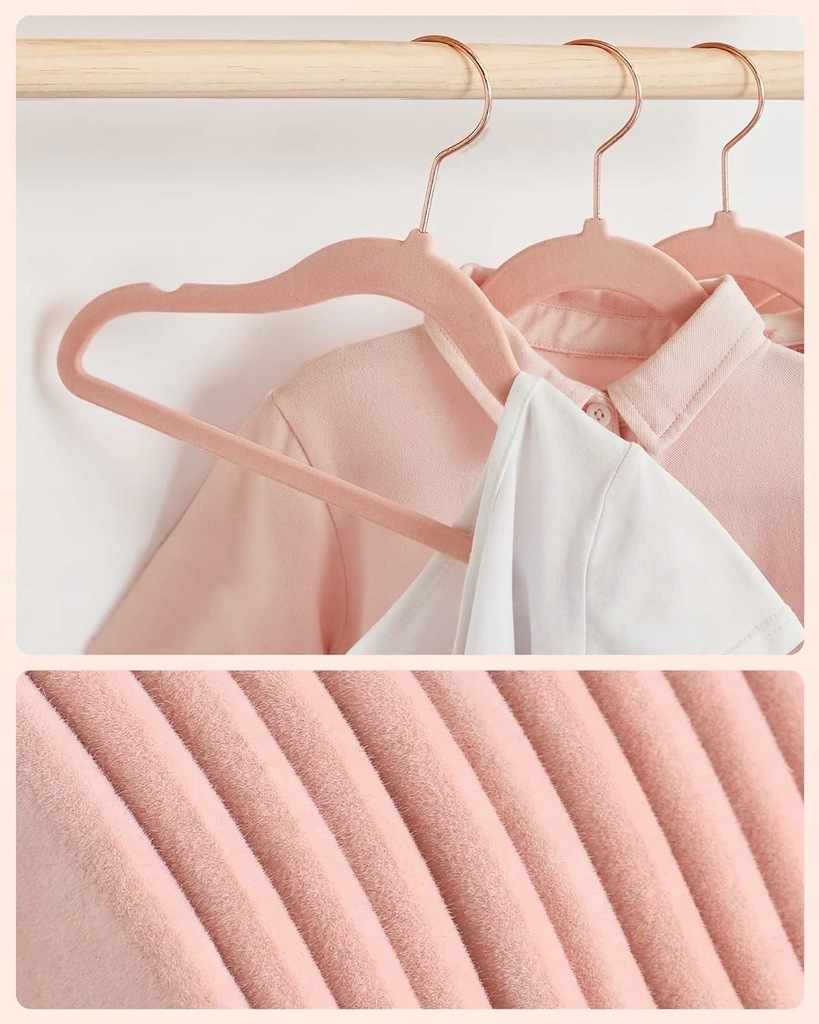 CO OTRZYMASZ: 50 aksamitnych wieszaków na płaszcze z antypoślizgowymi wycięciami w okolicy ramion, haczyki obrotowe 360° i konstrukcja o nośności do 3 kg, a także sposób na uporządkowanie garderoby