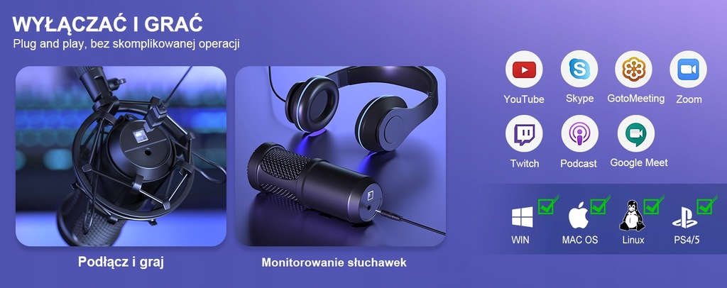 - Łatwy montaż: Mikrofon nie wymaga instalowania żadnych sterowników, jest kompatybilny z komputerami PC i laptopami z systemem Windows i Linux. Dzięki temu można go łatwo używać do rozmów, gier, nagrywania, podcastów i śpiewania. Nie jest przeznaczony do konsoli Xbox!