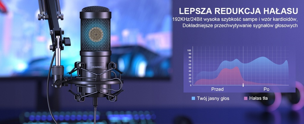 - Doskonała jakość dźwięku: W mikrofonie pojemnościowym zastosowano całkowicie nowy układ dźwiękowy. Uchwyć bogaty, pełny dźwięk ze źródeł znajdujących się bezpośrednio przed mikrofonem. Kardioidalny wzór odbioru minimalizuje szumy tła i izoluje główne źródło dźwięku, dzięki czemu dźwięk jest wyraźniejszy i bardziej realistyczny.