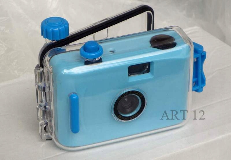 Aparat na kliszę, z dodatkową osłoną do zdjęć podwodnych i w czasie deszczu.