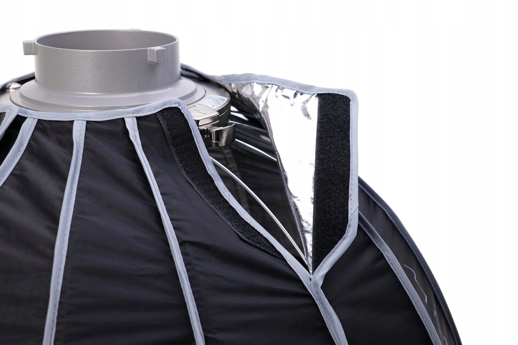 - Szybki montaż: Innowacyjny system szybkiego montażu oparty na szesnastu stalowych prętach pozwala na błyskawiczne złożenie i rozłożenie softboxa, a po złożeniu zachowuje płaski profil, co ułatwia transport i przechowywanie.