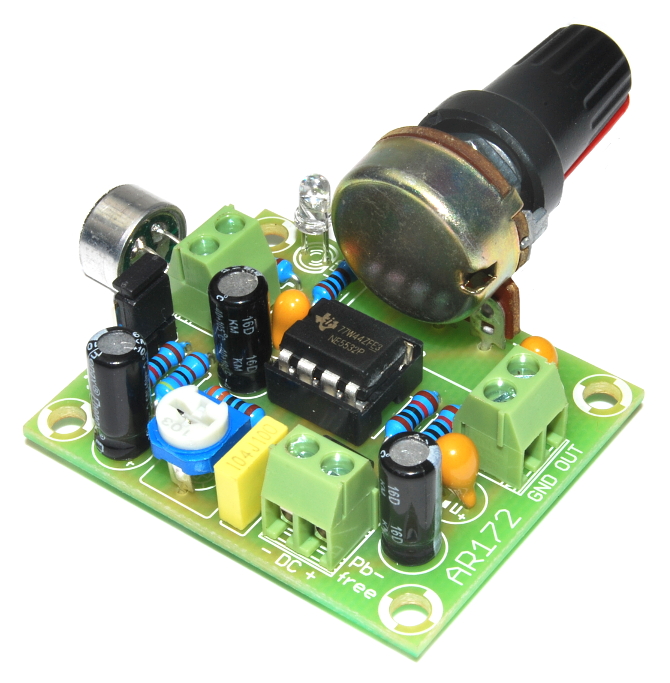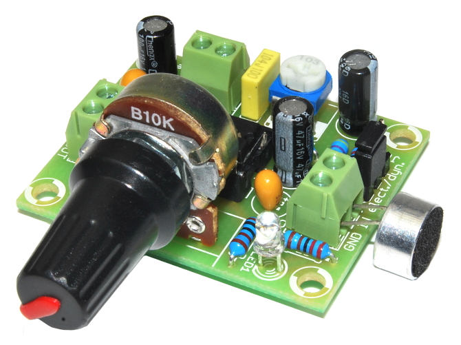 Uniwersalny wzmacniacz mikrofonowy, który może współpracować bezpośrednio z popularnymi mikrofonami elektretowymi oraz dynamicznymi. W układzie uzyskano wysoką jakość dźwięku, dzięki wykorzystaniu doskonałego wzmacniacza operacyjnego NE5532, kondensatorów tantalowych i rezystorów metalizowanych. Układ został zaprojektowany tak, aby przenosić całe pasmo słyszalne. Może też współpracować z wysokiej jakości mikrofonami dynamicznymi. Wzmacniacz posiada dwa stopnie wzmocnienia. Regulacja wstępna odbywa się za pomocą potencjometru montażowego, natomiast główna regulacja wzmocnienia - za pomocą potencjometru obrotowego. Układ posiada diodę sygnalizującą LED, informującą o prawidłowym podłączeniu układu do zasilania. Wzmacniacz polecany jest miłośnikom Karaoke, muzykom, akustykom, użytkownikom sprzętu nagłaśniającego i RTV oraz użytkownikom komputerów (np. do komunikatorów).