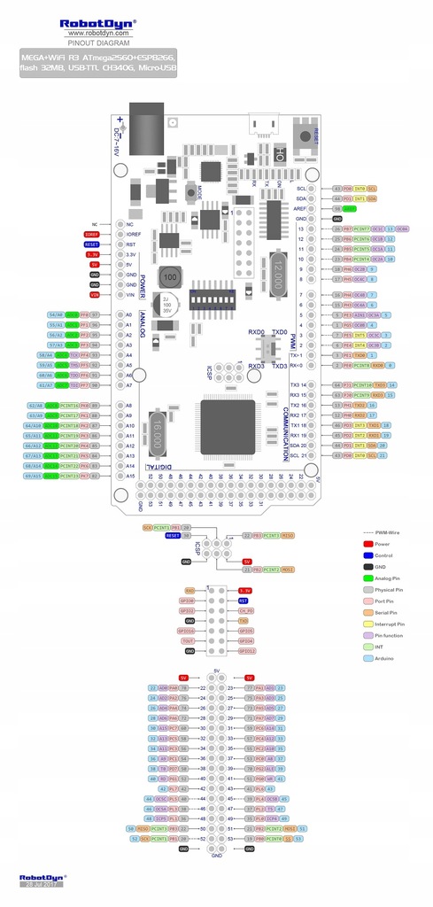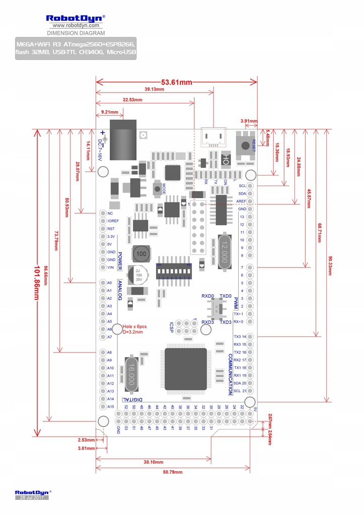 Piny zewnętrzne podłączone są do układu Mega2560. Jeśli chcesz skorzystać z pinów ESP8266, służą do tego goldpiny wewnątrz płytki, obok układu ESP8266. Pełny pinout znajduje się w zdjęciach.