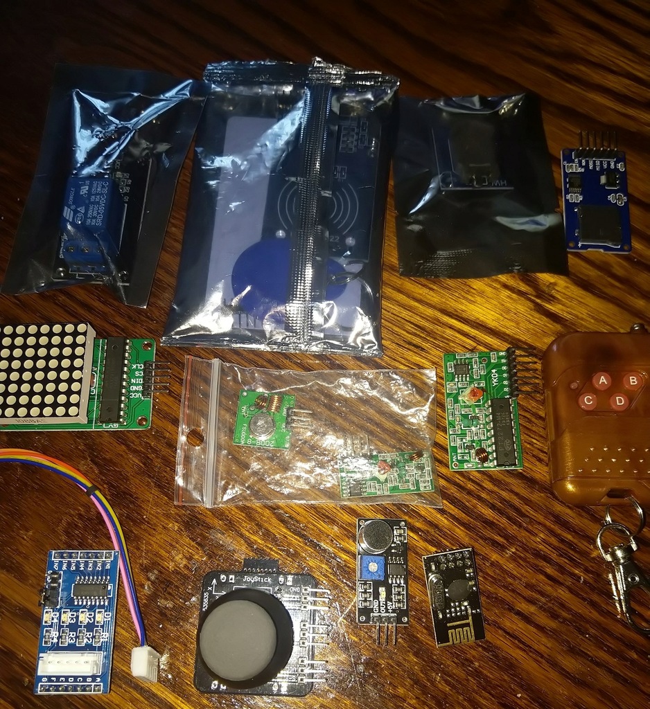 Dodatkowo kilkanaście mniejszych modułów: RFID-RC522 z kartą i brelokiem, nadajnik i odbiornik 433MHz, odbiornik + pilot 4 kanały (trzeba wymienić baterię), przekaźnik, moduł microSD, joystick analogowy, LCD8x8, moduł RTC DS1307 z AT24C32, ULN2003 z kablem, moduł WIFI, czujnik dźwięku.