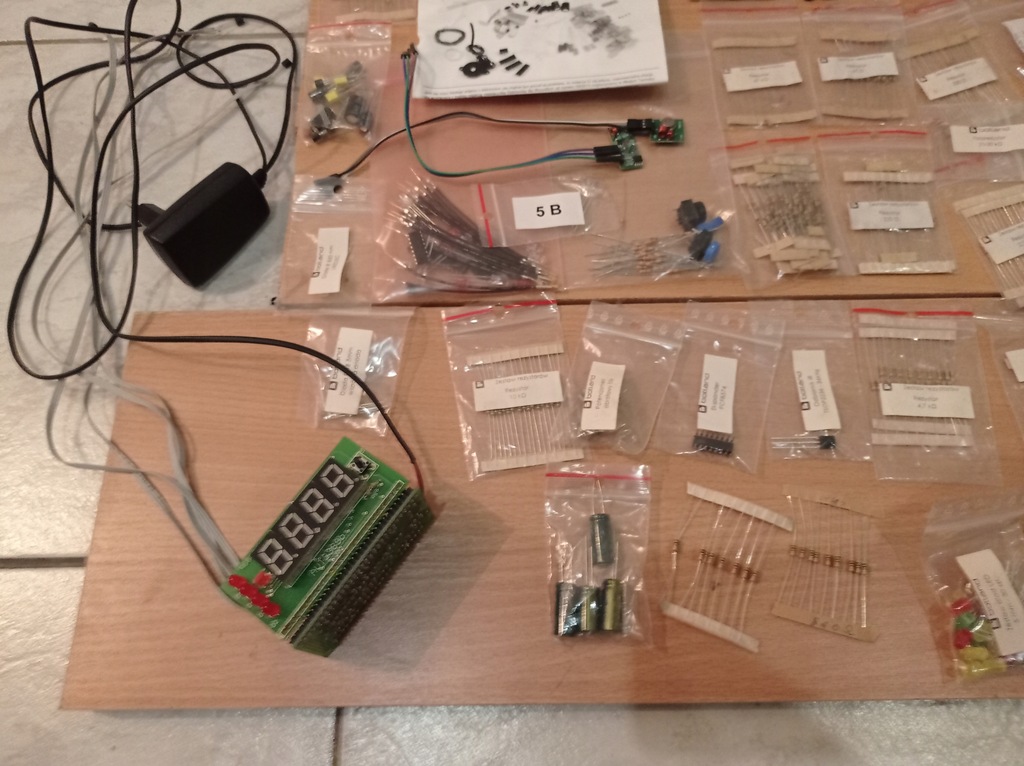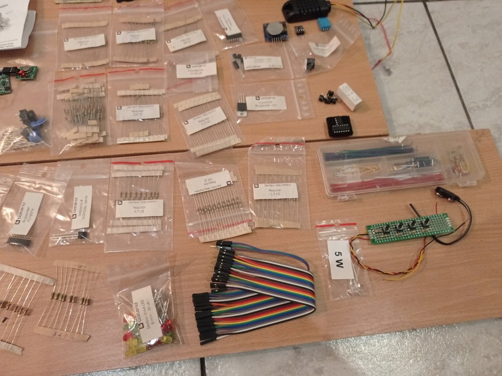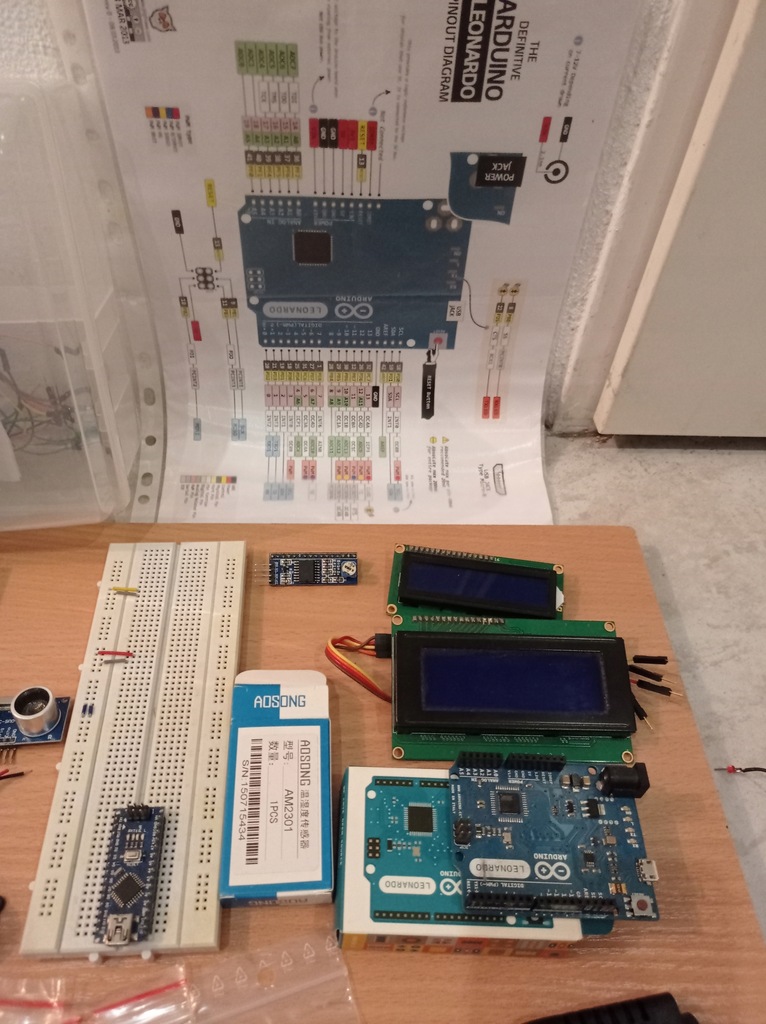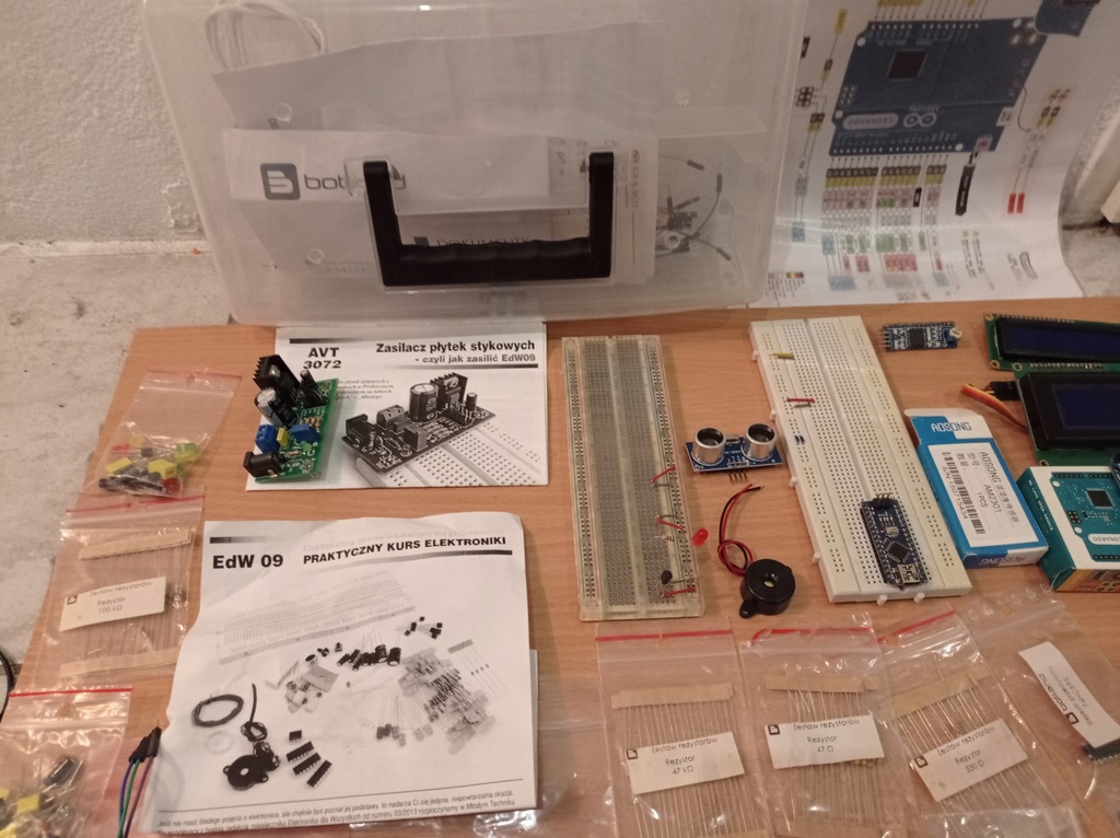 W zestawie są dwa moduły jeden oryginalny Leonardo , drugi mniejszy ten na płytce montażowej , dwa wyświetlacze , barometr , radio czujniki ultradzwiękowy i wiele innych podzespołów , przewody , zworki zasilacz , w zestawie czterokanałowy termometr w pełni zmontowany i sprawny , dokumentacja do arduino , pudełko projekty itp .