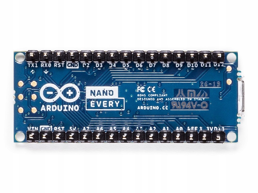 Arduino Nano Every jest odświeżoną wersją tradycyjnej płytki Nano. Wyposażona w układ ATMega4809 z taktowaniem 20MHz. Nano jest najmniejszą płytką z całej rodziny Arduino, jej wymiary wynoszą 45mm x 18mm. Jednocześnie jest ona znacznie mocniejsza od standardowej Nano, oferuje aż o 50% więcej pamięci programu i 2 razy więcej pamięci RAM. Posiada 2 listwy złącz - po 15 pinów na każdej (w sumie 30 pinów). Nano Every Board jest szczególnie zalecana do projektów niewielkich urządzeń o zaawansowanych funkcjach jak przetwarzanie dźwięku czy robotyka. Mikrokontroler ATSAMD11D14A działa jako konwerter USB-UART.