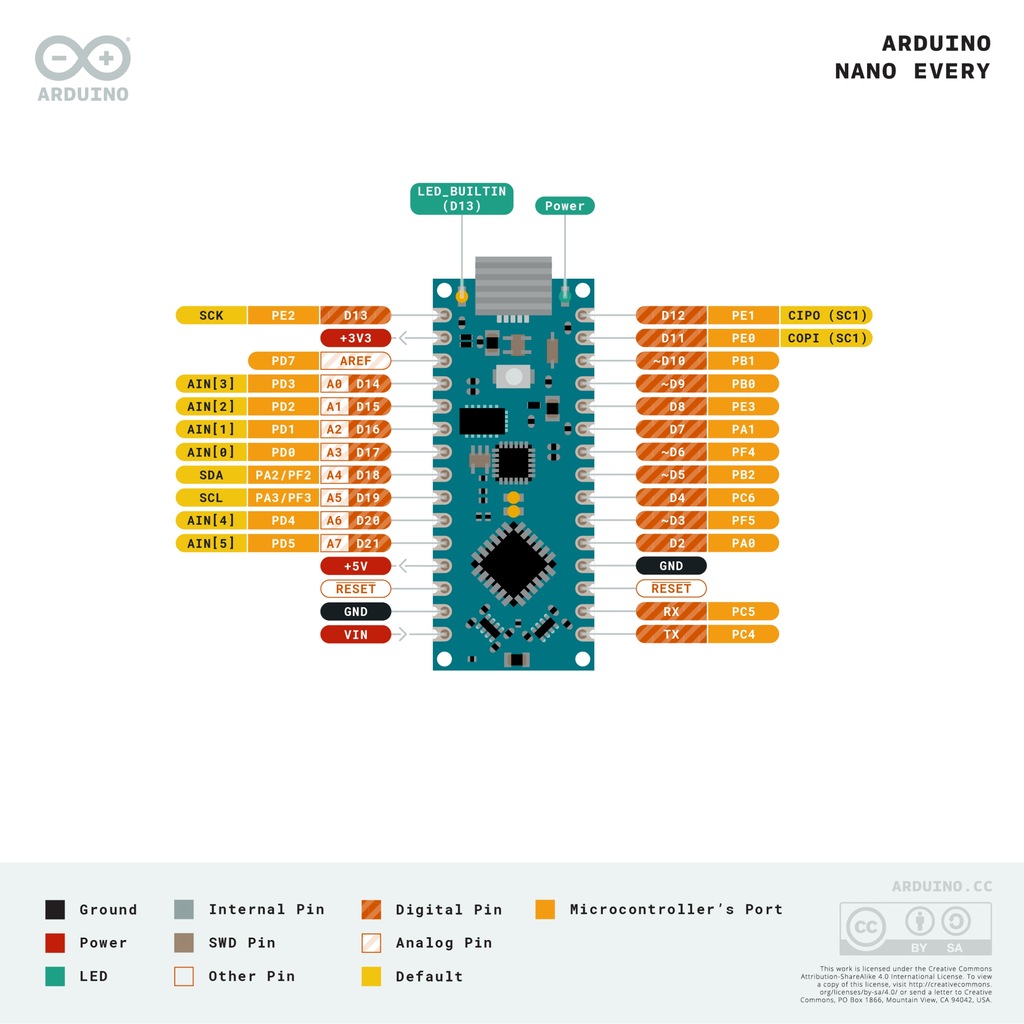 Mikrokontroler AVR Atmega4809 na płytce Arduino® Nano Every oferuje aż 14 cyfrowych wejść/wyjść (GPIO). 6 z nich można użyć jako wyjścia PWM (jasność diod LED, sterowanie silnikami). 8 portów można użyć również jako wejścia analogowe (ADC).