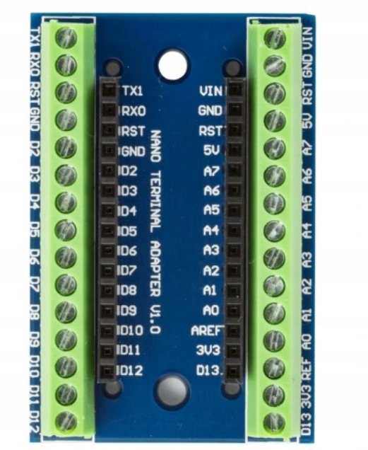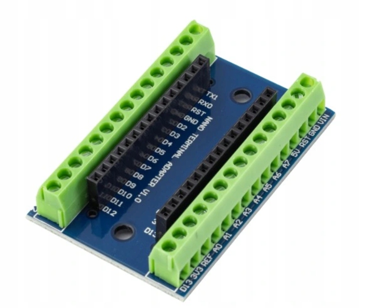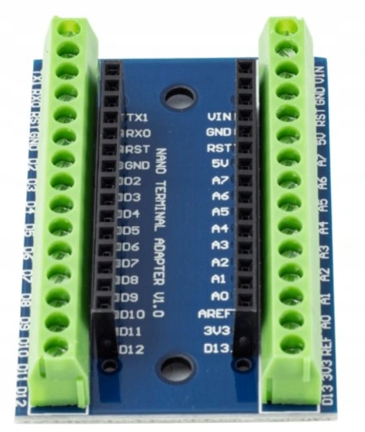 Nakładka (shield) rozszerzeniowa dla Arduino Nano oraz kompatybilnych modułów jak ST Nucleo-32. W prosty sposób można przekształcić złącza goldpin na śrubowe złącza typu ARK.