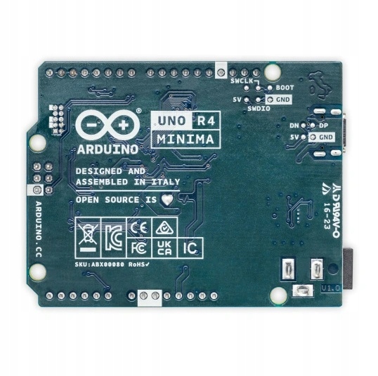 Arduino Uno R4 Minima jest następcą najpopularniejszej płytki z serii Arduino czyli Arduino UNO R3. Bazuje na wydajnym 32-bitowym japońskim mikrokontrolerze Renesas RA4M1 ARM Cortex M4. Od poprzednika posiada znacznie więcej pamięci Flash - 256 kB zamiast 32kB oraz 32 kB pamięci SRAM zamiast 2kB. Jest również taktowany szybszym zegarem: 48MHz zamiast 16MHz.