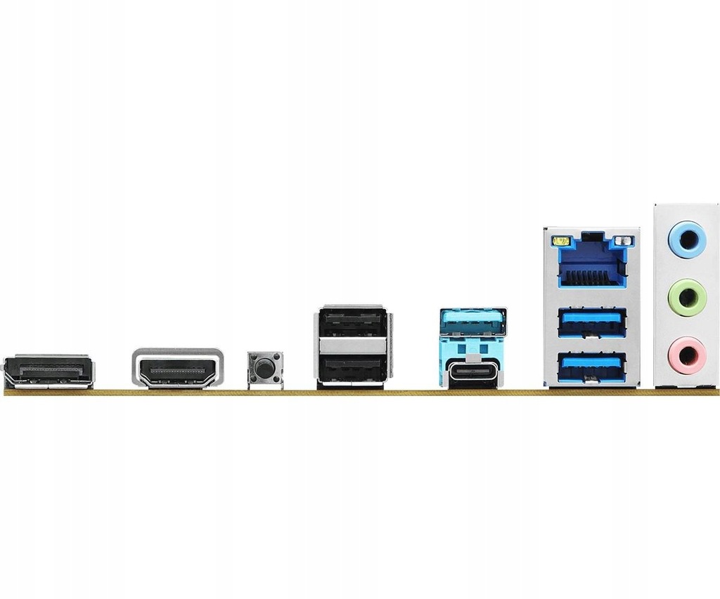 - Złącza zewnętrzne: 1 x USB 3.2 Gen 1 Type-C, 3 x USB 3.2 Gen 1 Type-A, 2 x USB 2.0, 1 x RJ-45, 1 x MIC (różowy / microphone), 1 x Line Out (zielony / headphones), 1 x Line In (błękitny), 1 x HDMI, 1 x DisplayPort, 2 x SMA, 1 x Przycisk BIOS Flash