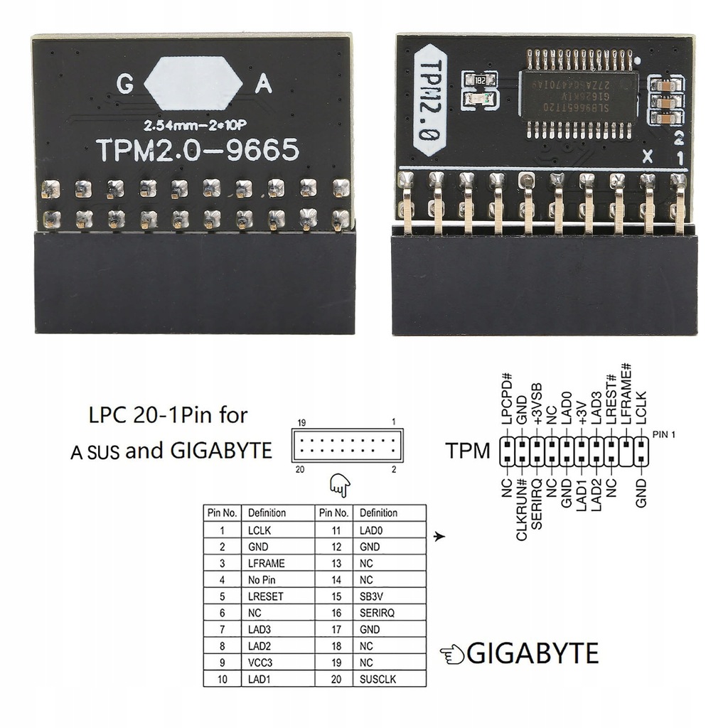 5、适用范围:TPM 2.0模组2.54mm间距,2x10P,20个1针技嘉安全模组,华硕专用。