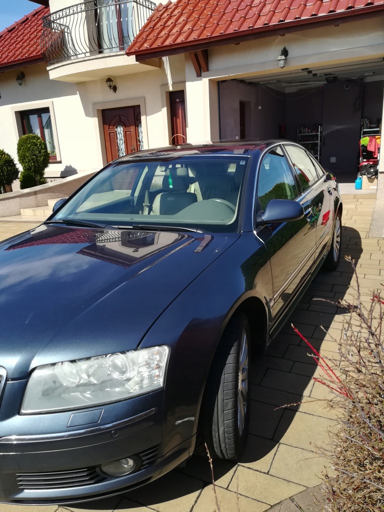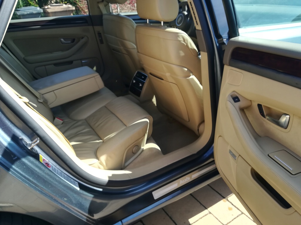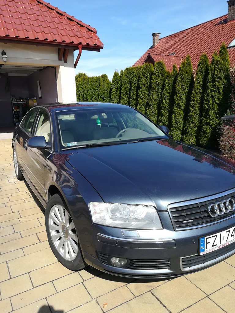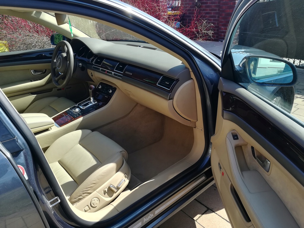 Mam do sprzedania piękne i dobrze utrzymane Audi A8 4.2 V8 quattro z 2002 roku (benzyna). Pierwszy właściciel w Polsce, data pierwszej rejestracji 09.02.2018. Samochód posiada bardzo bogaty zestaw wyposażenia (wersja A8S). Fotele obszyte są beżową skórą w bardzo dobrym stanie, dostępnych jest wiele udogodnień, takich jak chociażby elektrycznie otwierany szyberdach z roletą, reflektory xenonowe, automatyczna skrzynia biegów z trybem sportowym, pneumatyczne zawieszenie, elektryczna regulacja foteli i wiele innych. Samochód posiada bardzo mocny silnik benzynowy o mocy 335 KM (V8), który przy ekonomicznej jeździe potrafi spalić niewiele ponad 8l/100km. W samochodzie zamontowane są NOWE opony Dunlop Sport 255/45/18 99V z oryginalnymi felgami audi w idealnym stanie (1 opona kosztuje ok. 700 zł!). Przy przebiegu ok. 235 tys. km wymieniony był kompletny rozrząd oraz akumulator (gwarancja). Samochód posiada piękny lakier ciemnoszary wchodzący w odcienie niebieskiego (northern light pearl). Dodatkowo w tej wersji wyposażenia jest oryginalny system nagłośnienia Bose.