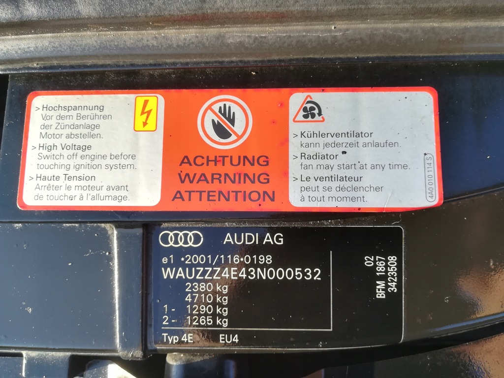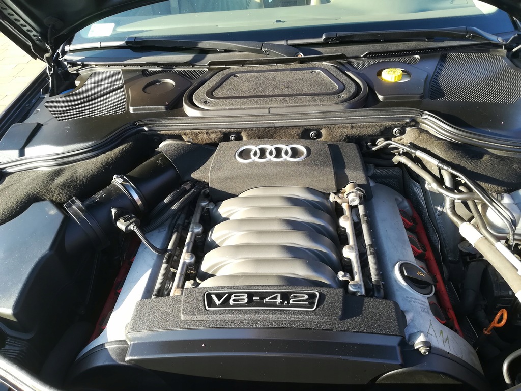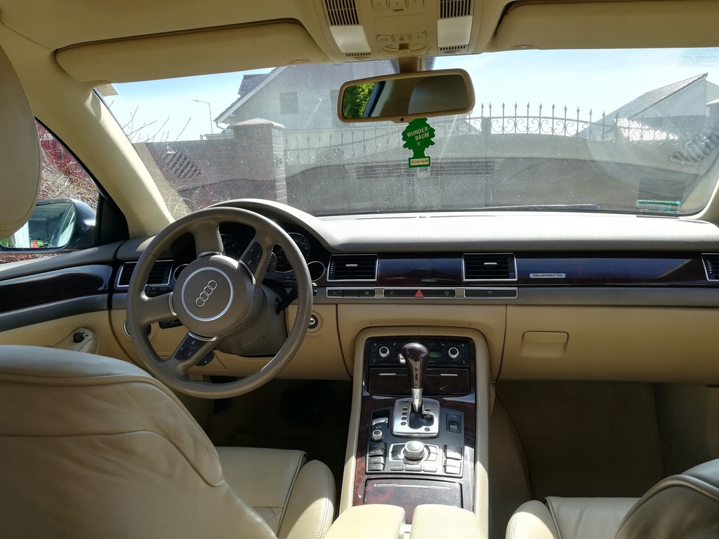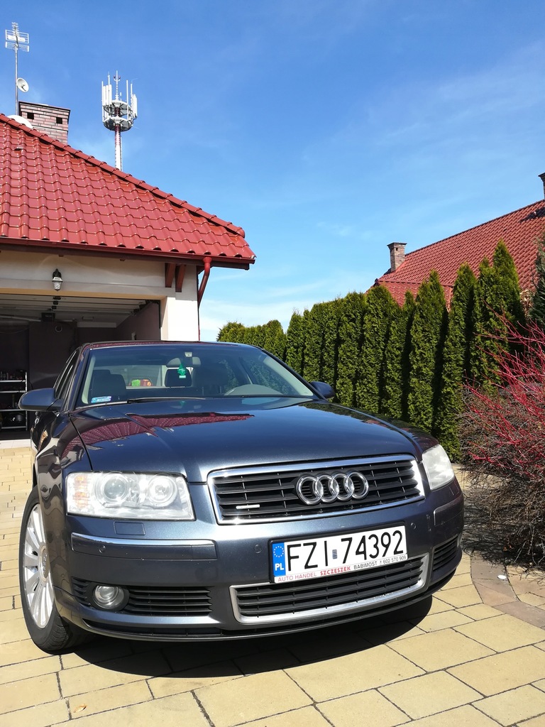 Mam do sprzedania piękne i dobrze utrzymane Audi A8 4.2 V8 quattro z 2002 roku (benzyna). Pierwszy właściciel w Polsce, data pierwszej rejestracji 09.02.2018. Samochód posiada bardzo bogaty zestaw wyposażenia (wersja A8S). Fotele obszyte są beżową skórą w bardzo dobrym stanie, dostępnych jest wiele udogodnień, takich jak chociażby elektrycznie otwierany szyberdach z roletą, reflektory xenonowe, automatyczna skrzynia biegów z trybem sportowym, pneumatyczne zawieszenie, elektryczna regulacja foteli i wiele innych. Samochód posiada bardzo mocny silnik benzynowy o mocy 335 KM (V8), który przy ekonomicznej jeździe potrafi spalić niewiele ponad 8l/100km. W samochodzie zamontowane są NOWE opony Dunlop Sport 255/45/18 99V z oryginalnymi felgami audi w idealnym stanie (1 opona kosztuje ok. 700 zł!). Przy przebiegu ok. 235 tys. km wymieniony był kompletny rozrząd oraz akumulator (gwarancja). Samochód posiada piękny lakier ciemnoszary wchodzący w odcienie niebieskiego (northern light pearl). Dodatkowo w tej wersji wyposażenia jest oryginalny system nagłośnienia Bose.